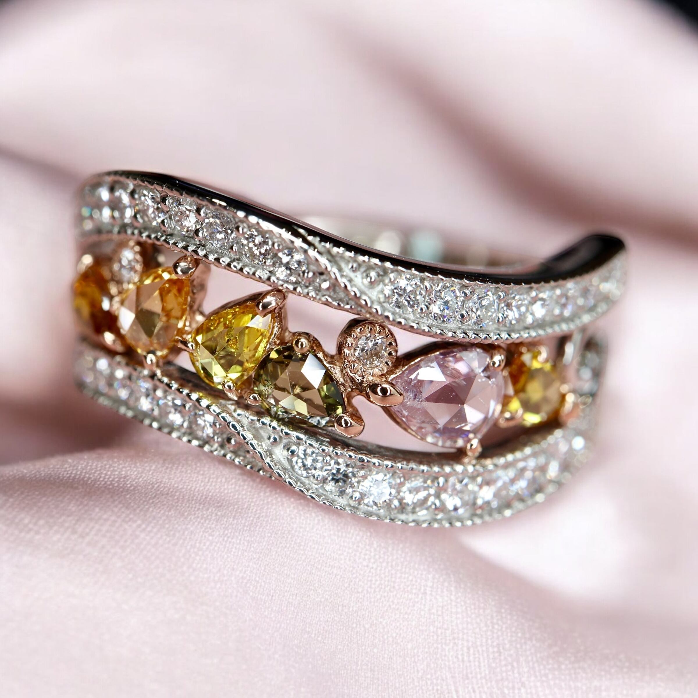 ナチュラルのカラーダイヤモンドローズカットをふんだんにあしらい1つで存在感際立つスペシャルなリングです。