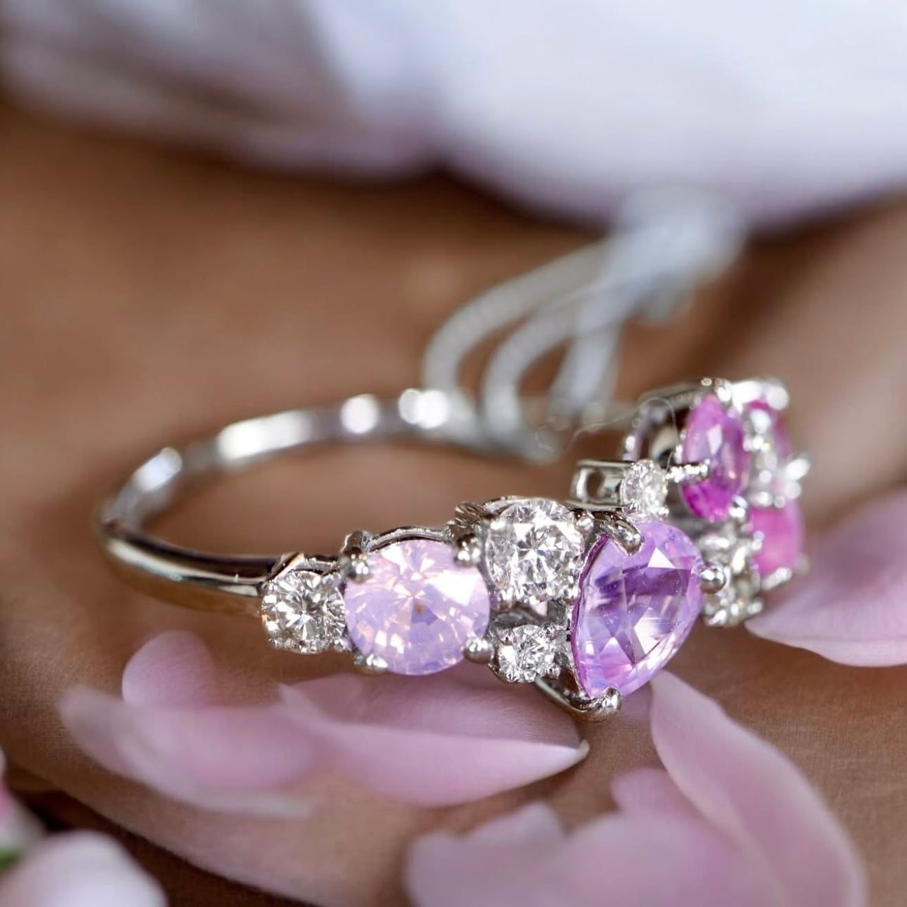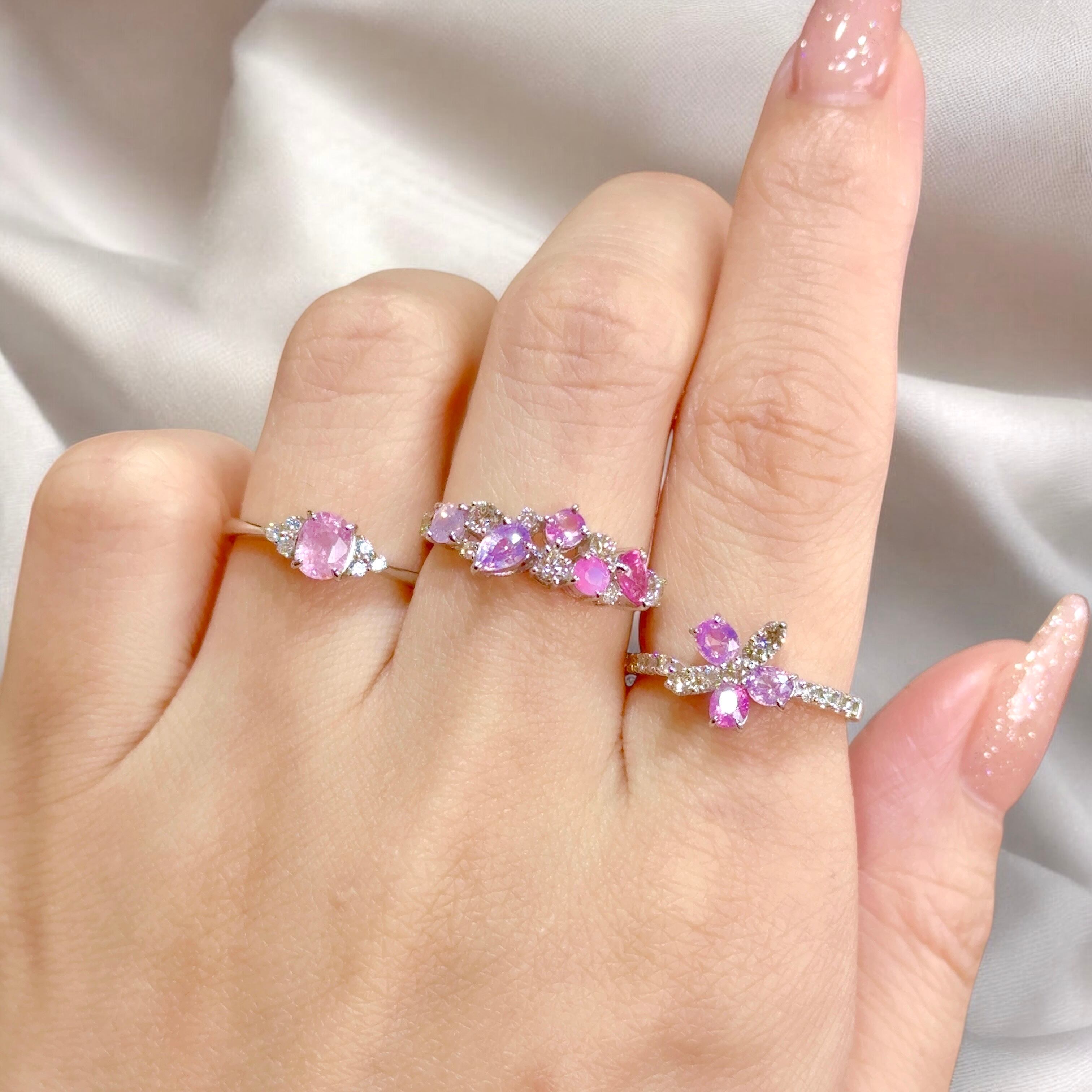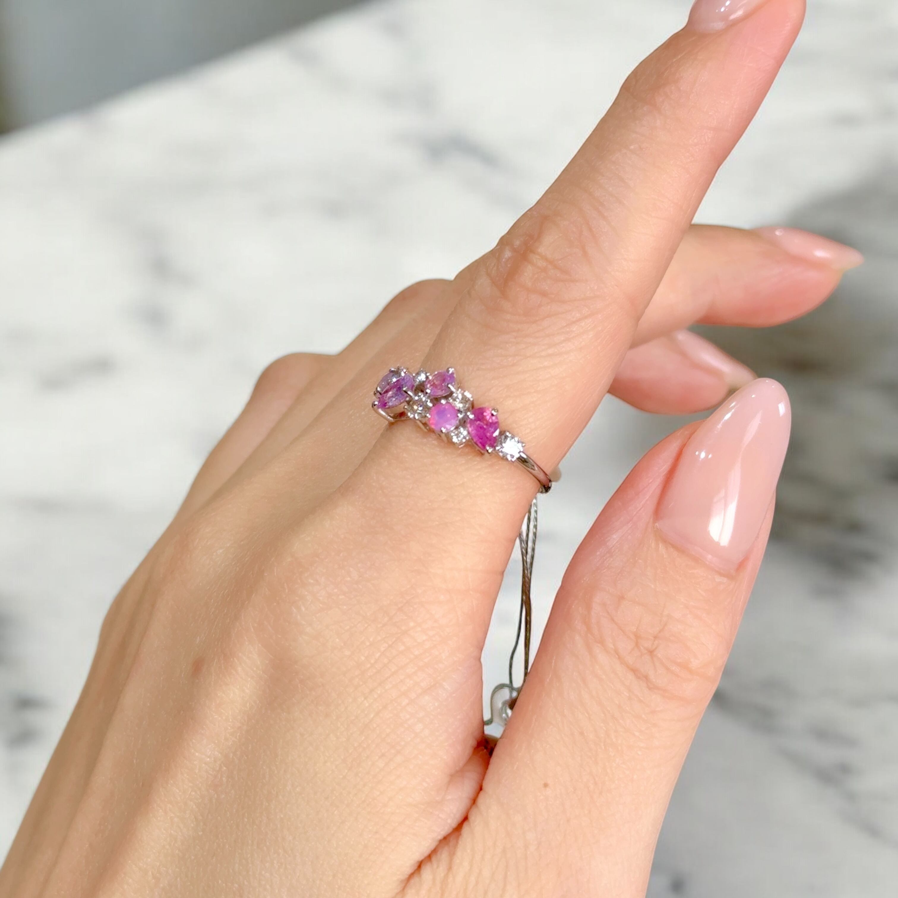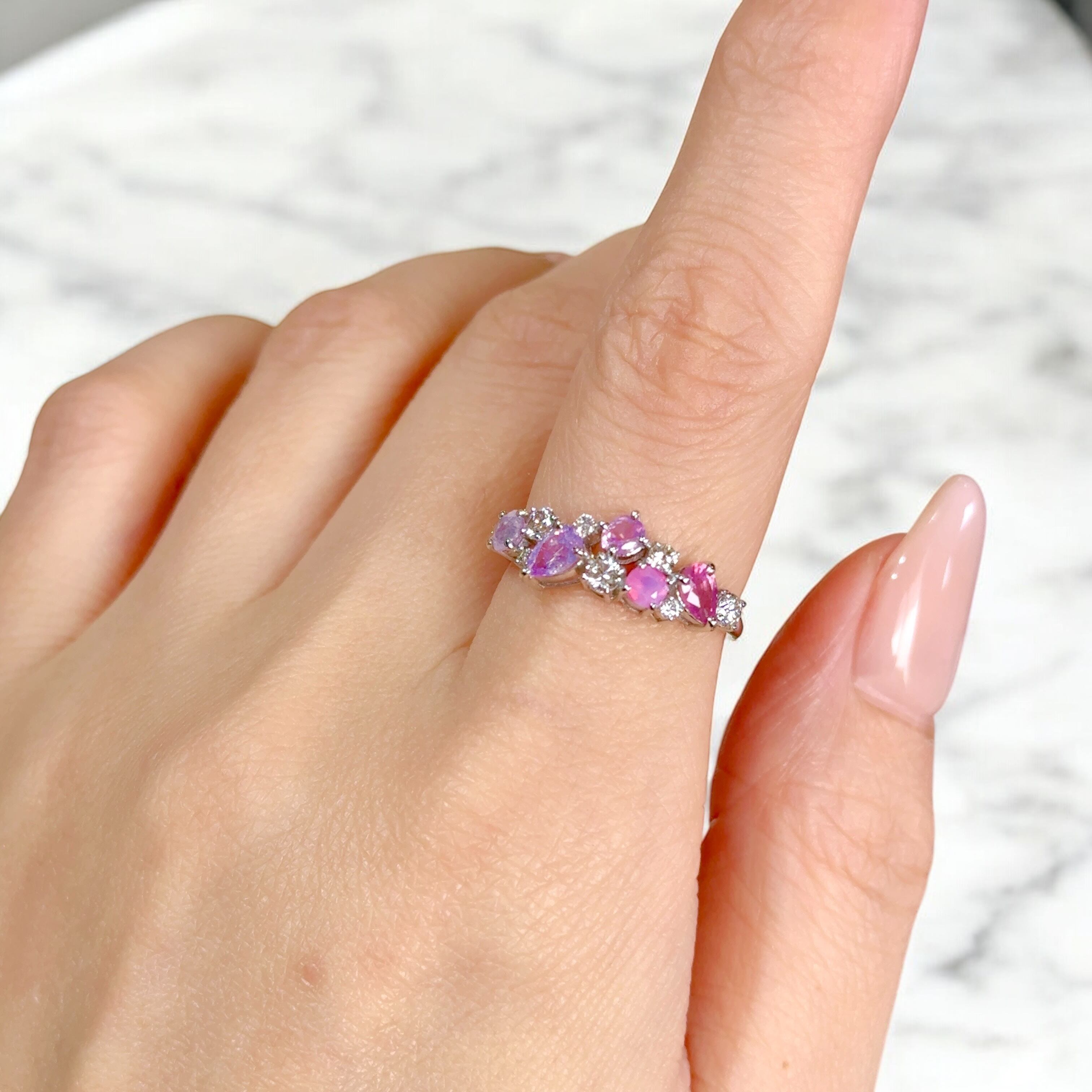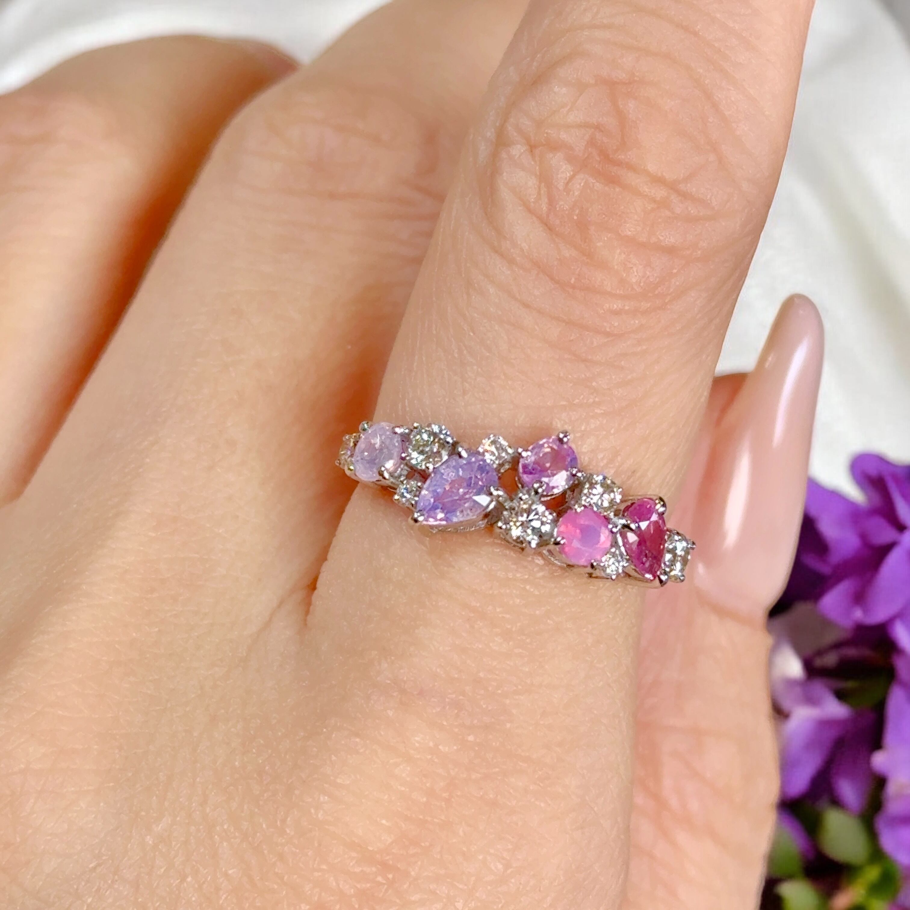 様々なピンクからパープルのシルキーサファイアを随所にあしらった非常に贅沢で美しいリングです。
