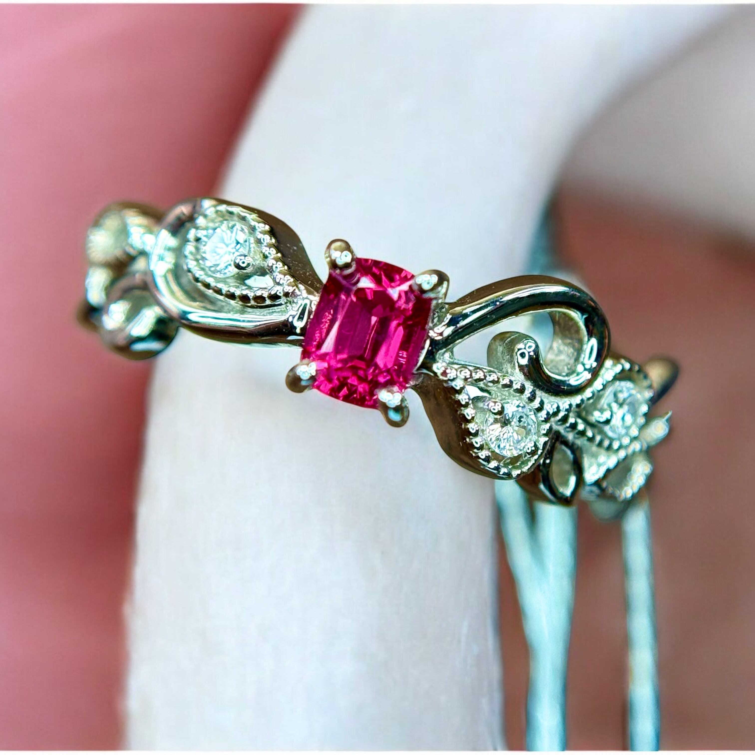 お指から浮かび上がる地金模様が本当に素敵でこの本筋のピンクスピネルに非常にマッチしたデザインです。