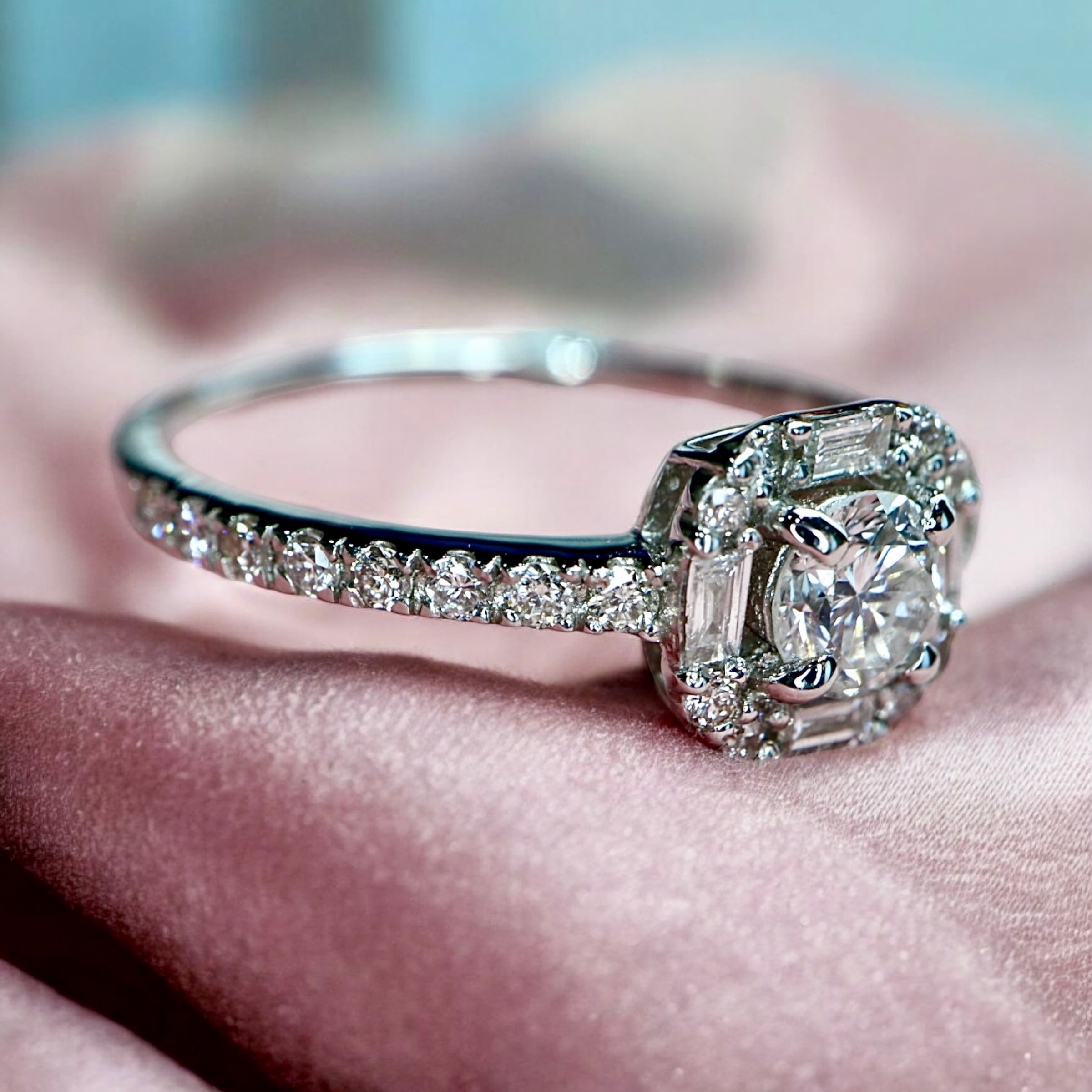 バゲットカットダイヤとラウンドカットダイヤのスクエアの中にラウンドブリリアントカットダイヤモンド。