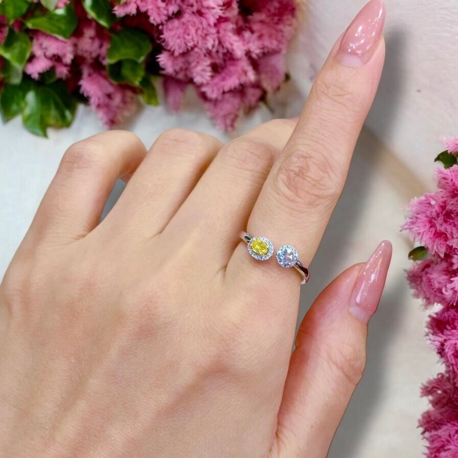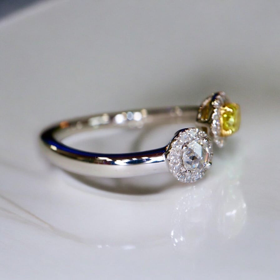 側でウルウルと輝くカラーレスダイヤローズカット0.15ctも無色で非常に美しいことからはっきりとしたイエローとカラーレスのコントラストが見事です。