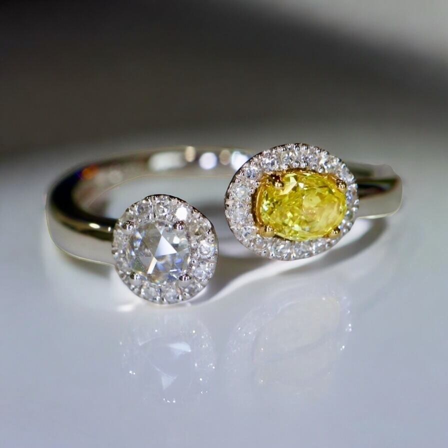 ファンシーヴィヴィッドイエローオーバルシェイプとカラーレスのローズカットダイヤモンドラウンド。