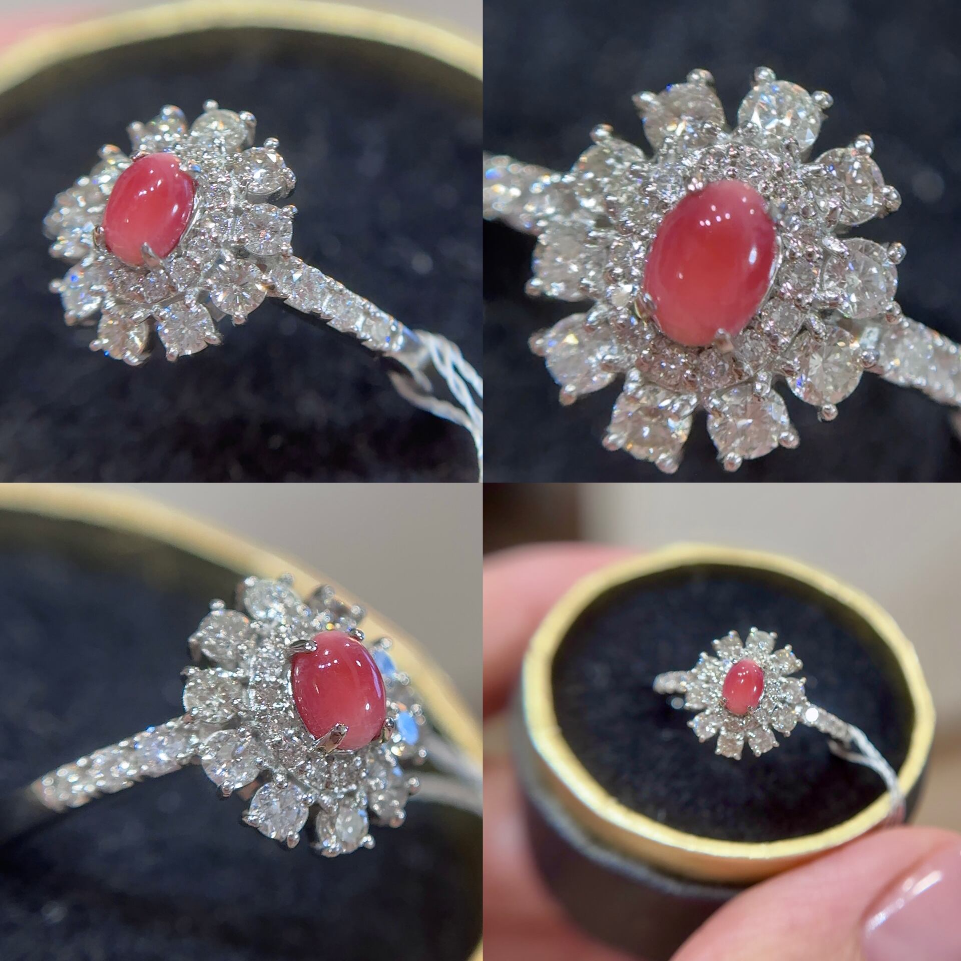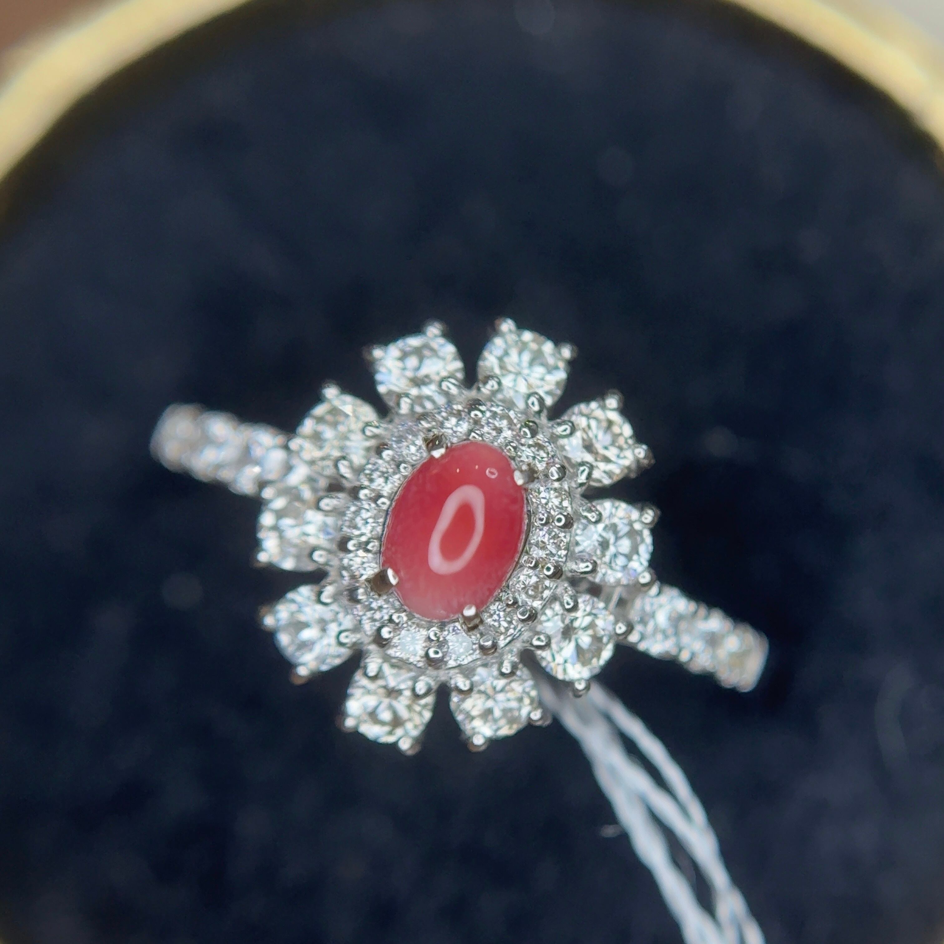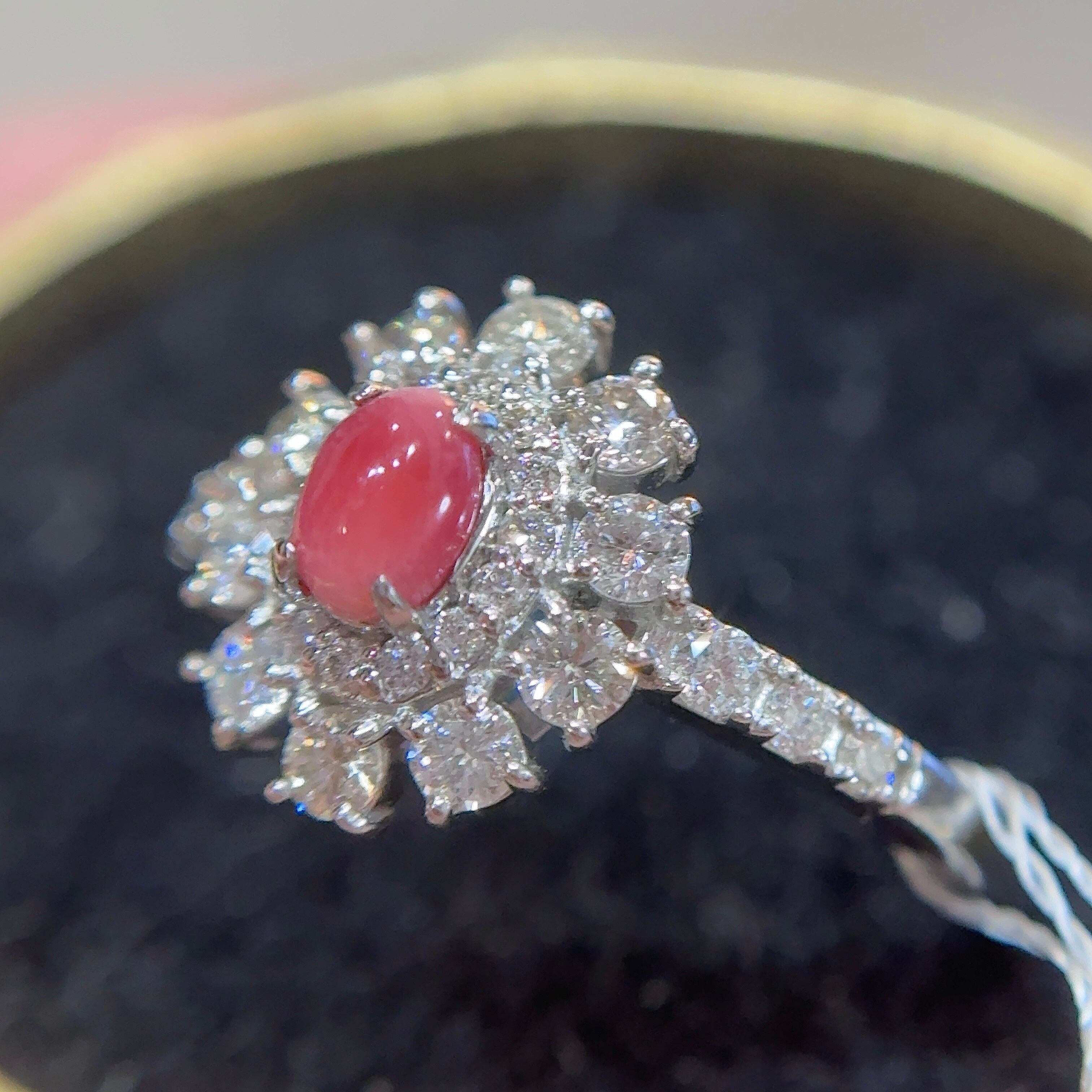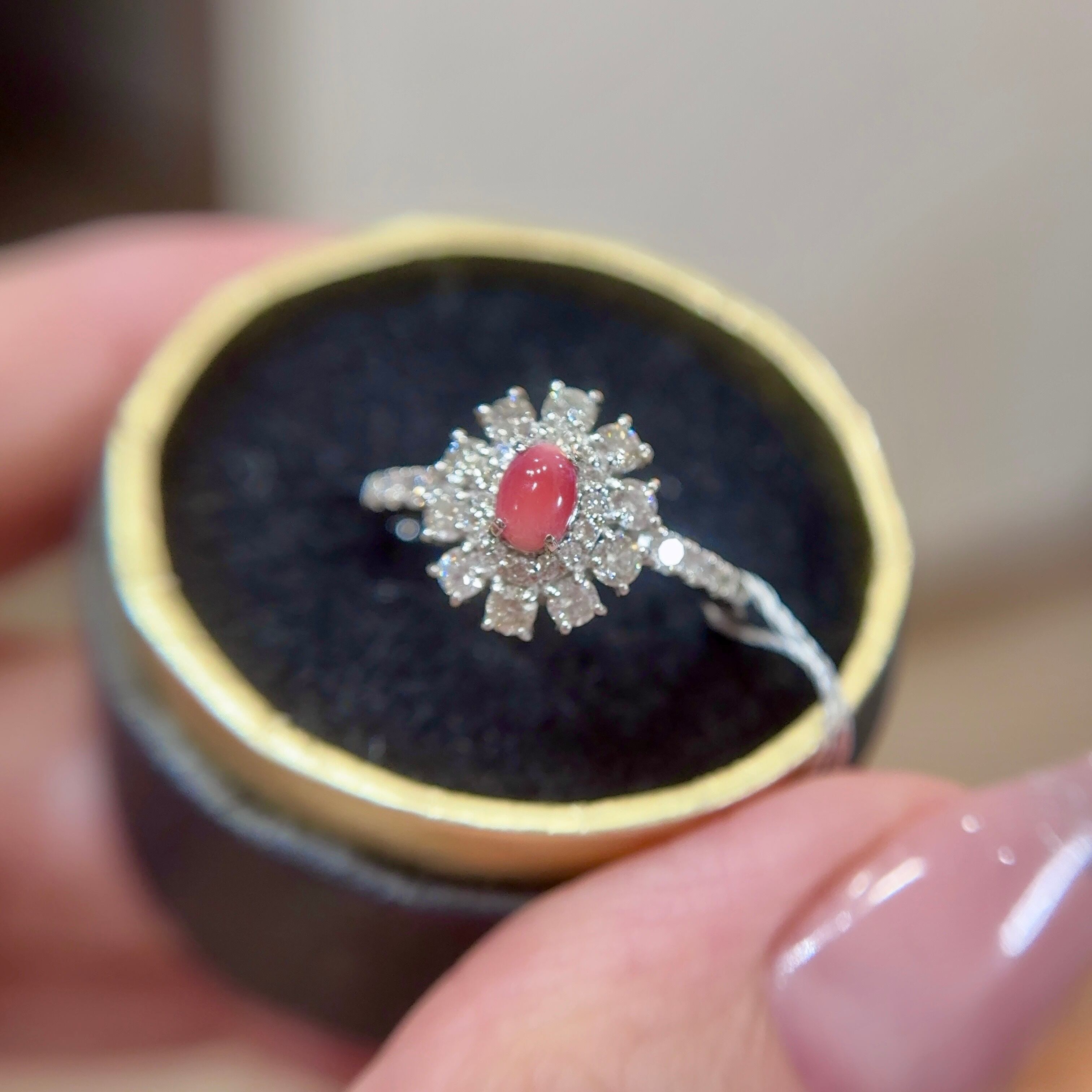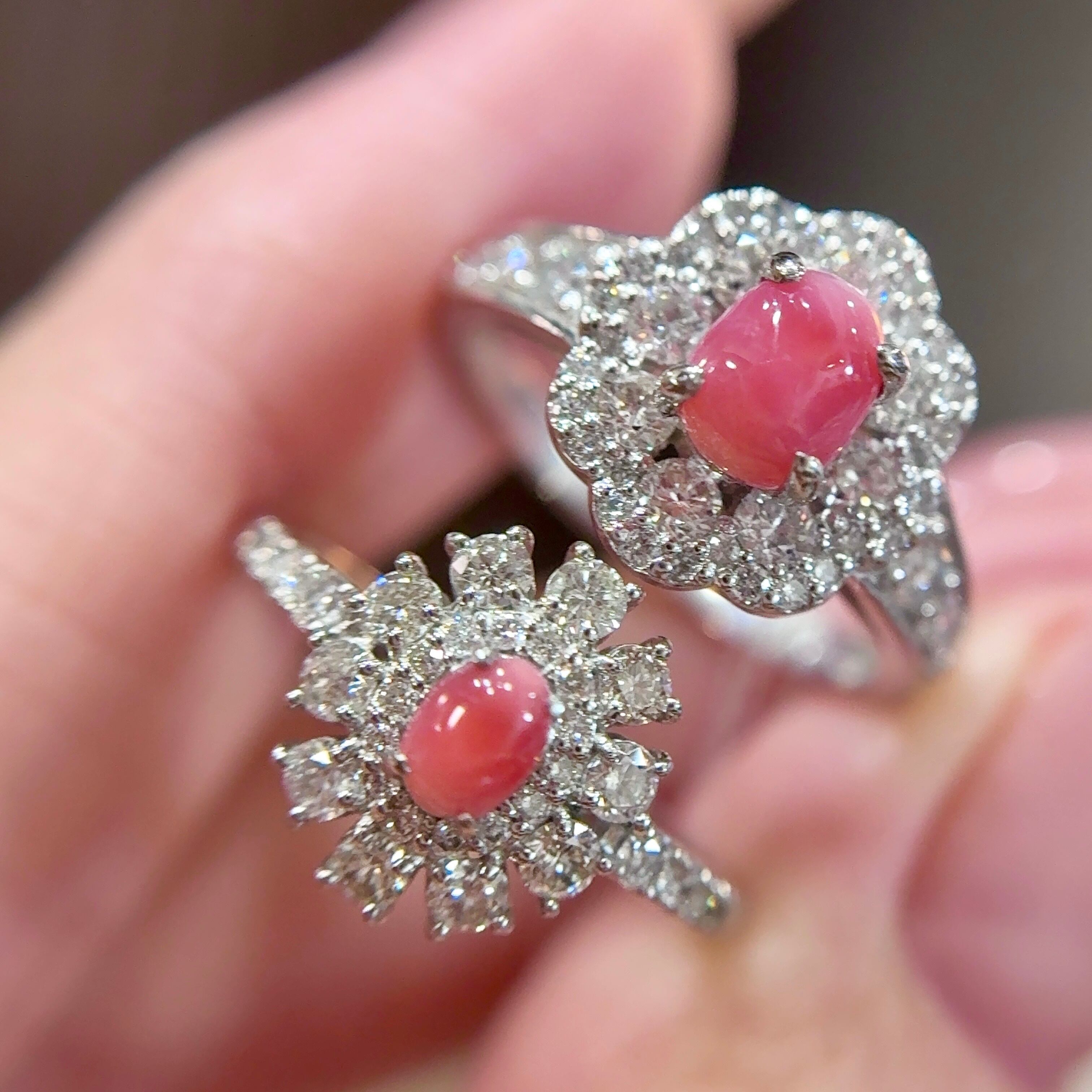 繊細に組み合わされた美しいダイヤモンドデザインがセンターに高揚したピンクのコンクパールを更に美しく魅せます。