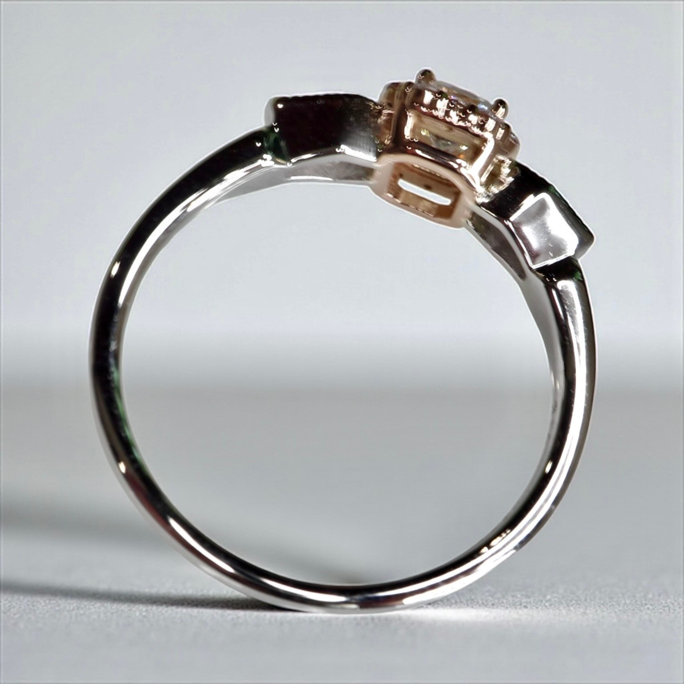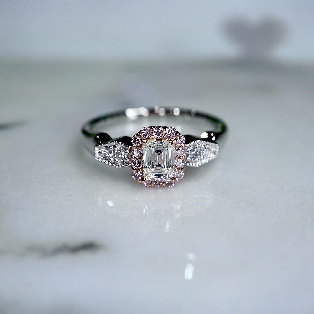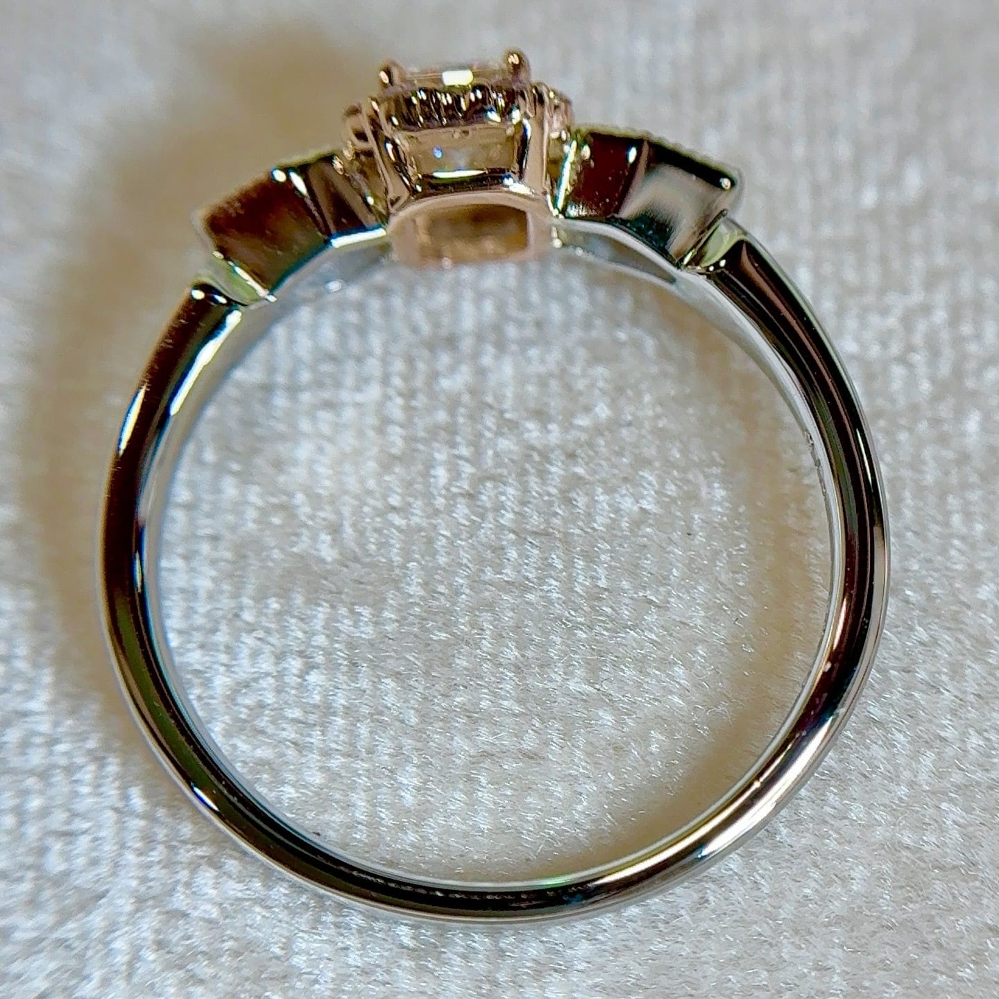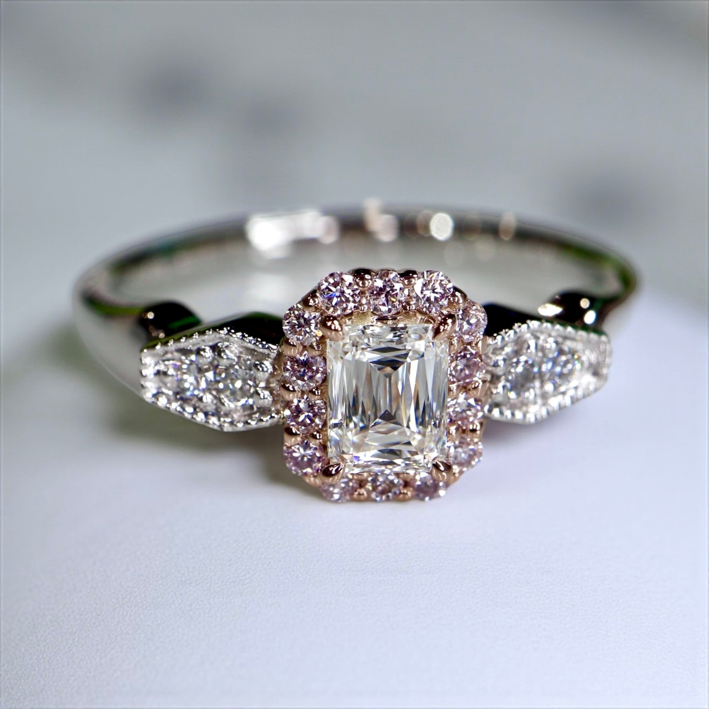 レクタンギュラーカットダイヤモンドピンクダイヤ取り巻きデザインリングpt950/K18 D0.352ctD0.08ctソーティング
