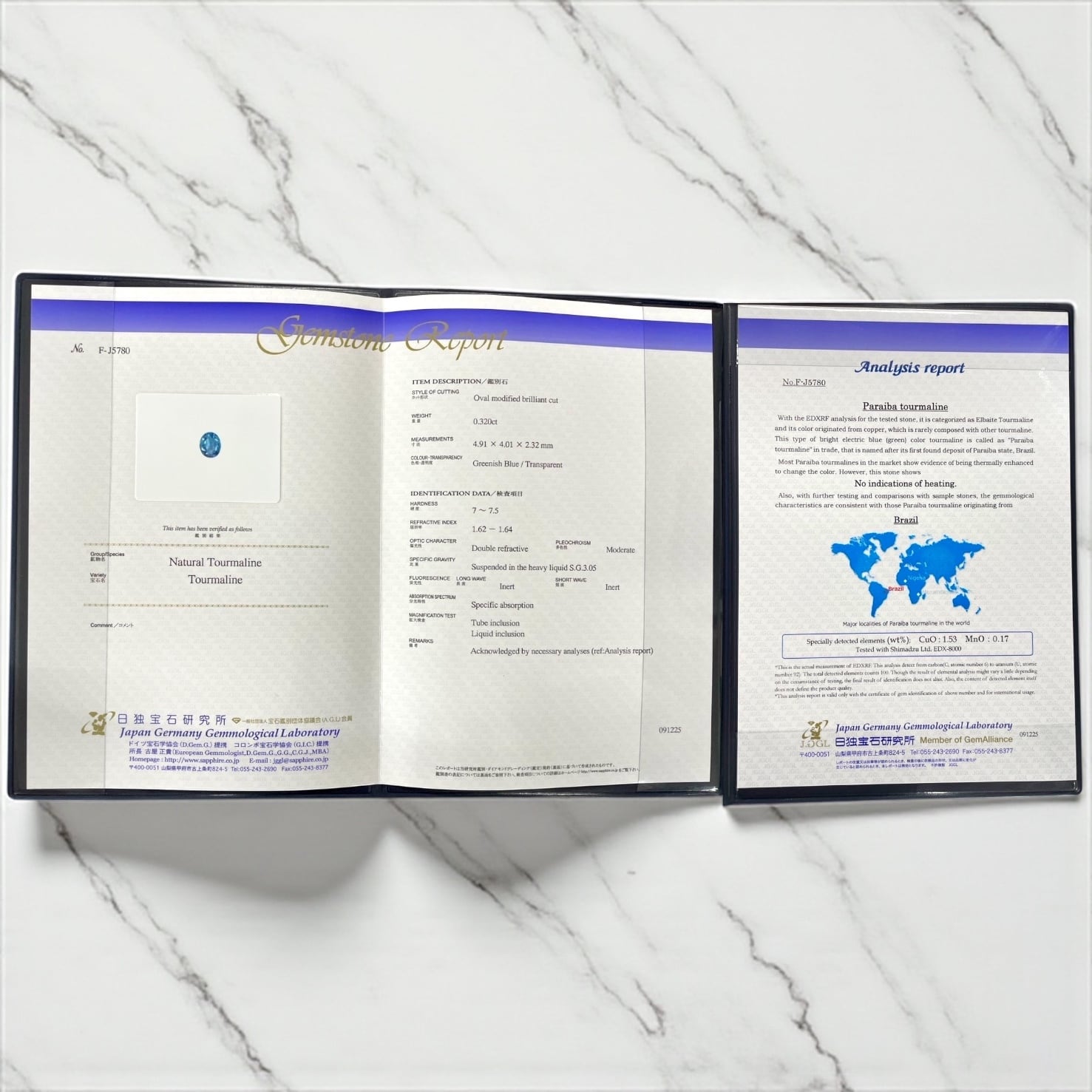 ブラジル産非加熱パライバトルマリンpt900PA0.32ctD0.20ct鑑別分析付き
