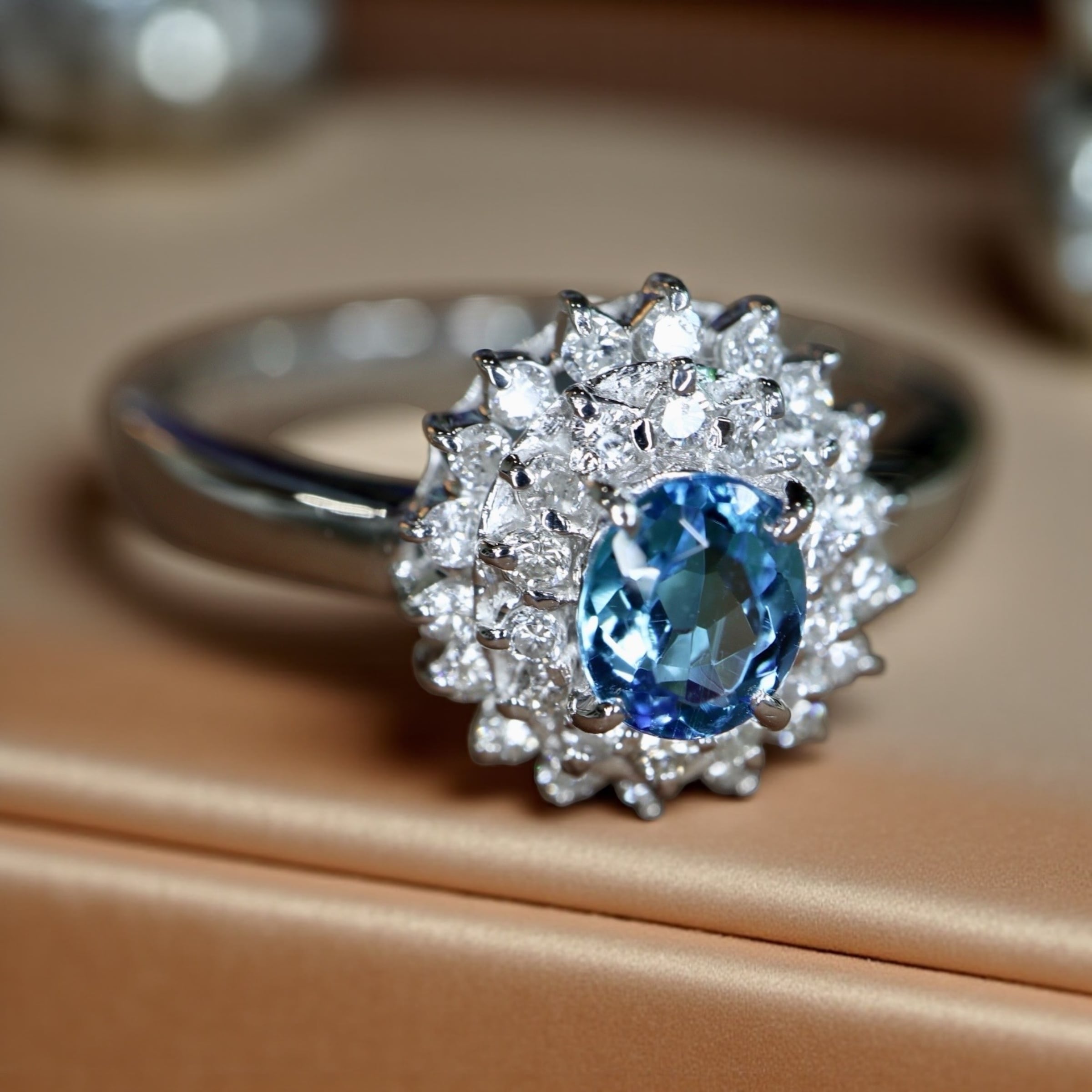 二重ダイヤモンドデザインが中心のパライバを美しく包み込み研ぎ澄まされた光のコントラストを放つデザイン。