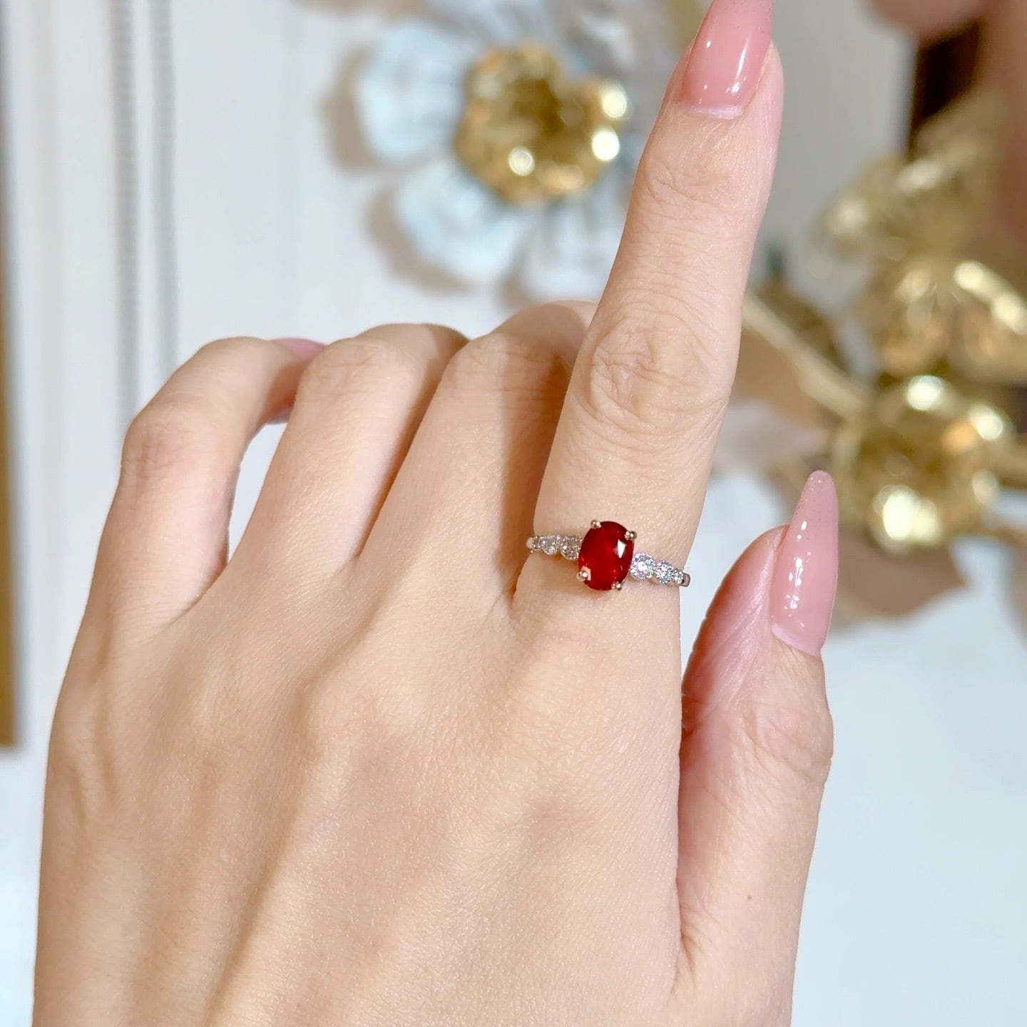 クラリティも高くカットも美しく仕上げられているため、光を受けて内側からメラメラ輝くような赤い煌めきが魅力です。