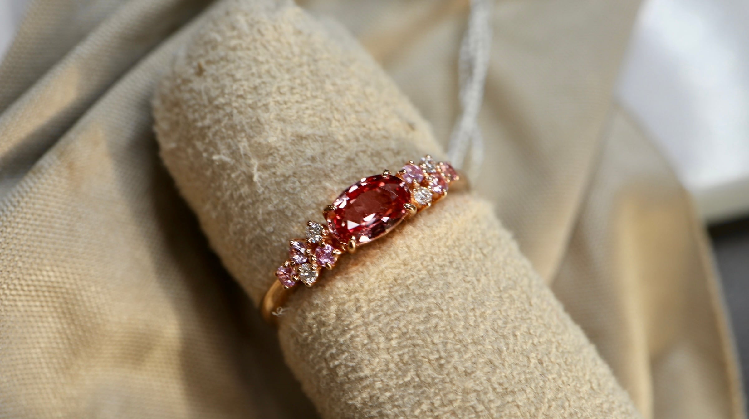パパラチアサファイアをセンターに脇にもパパラチアサファイアとダイヤモンドのパヴェスタイル。
