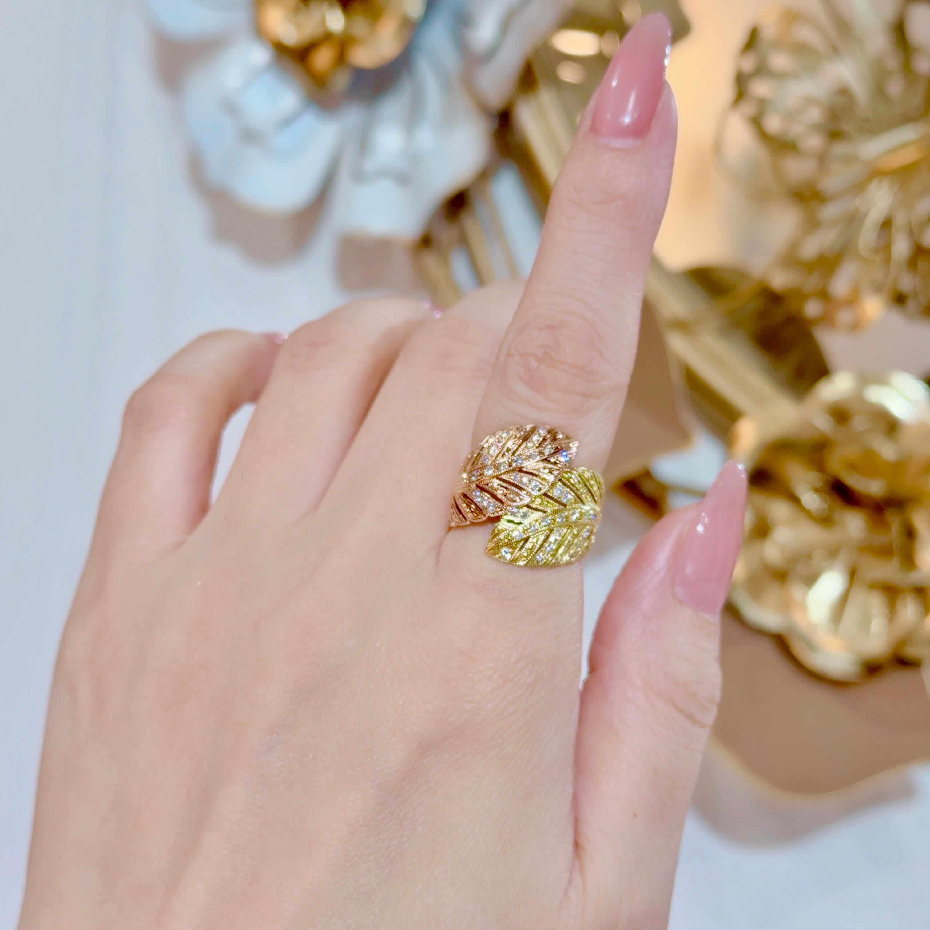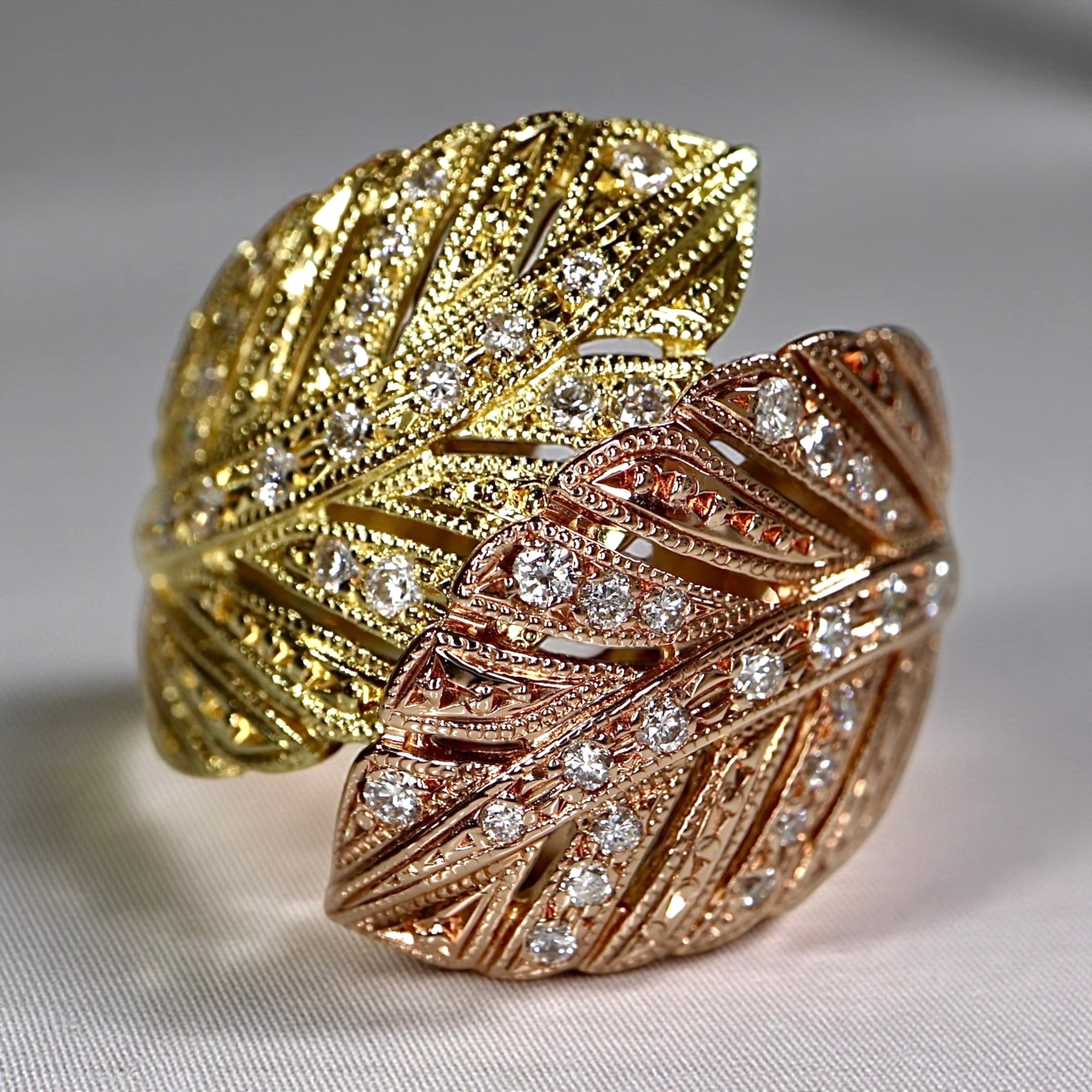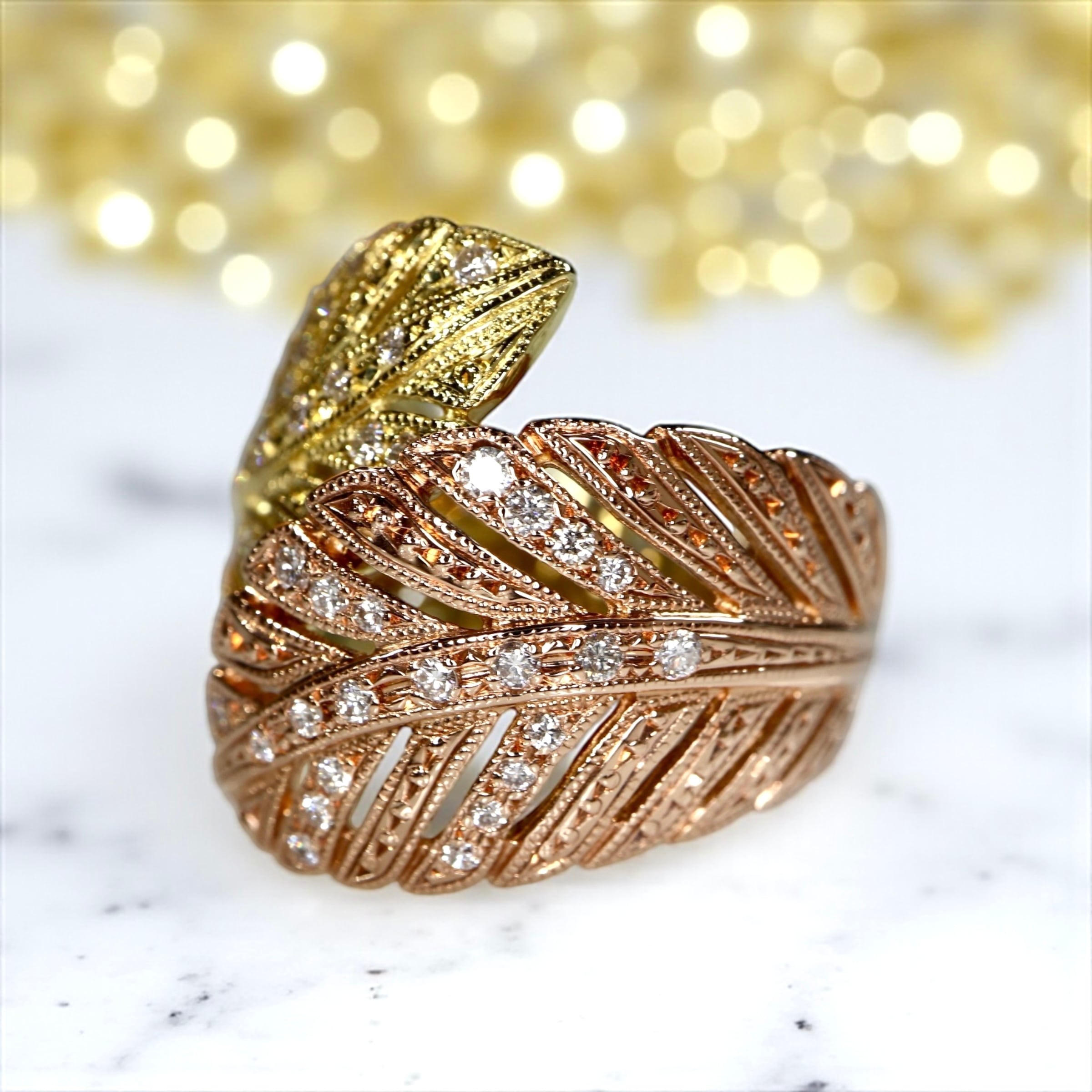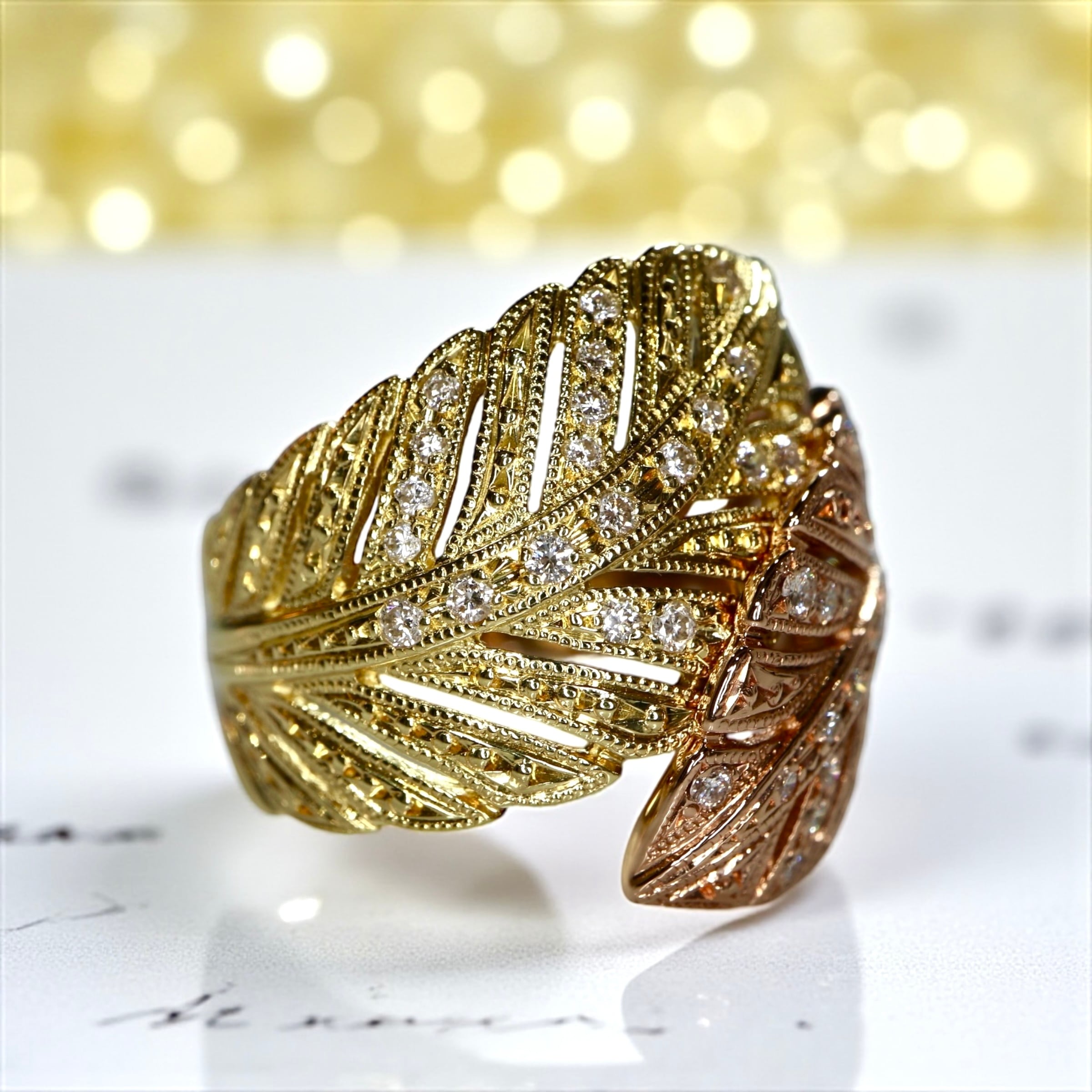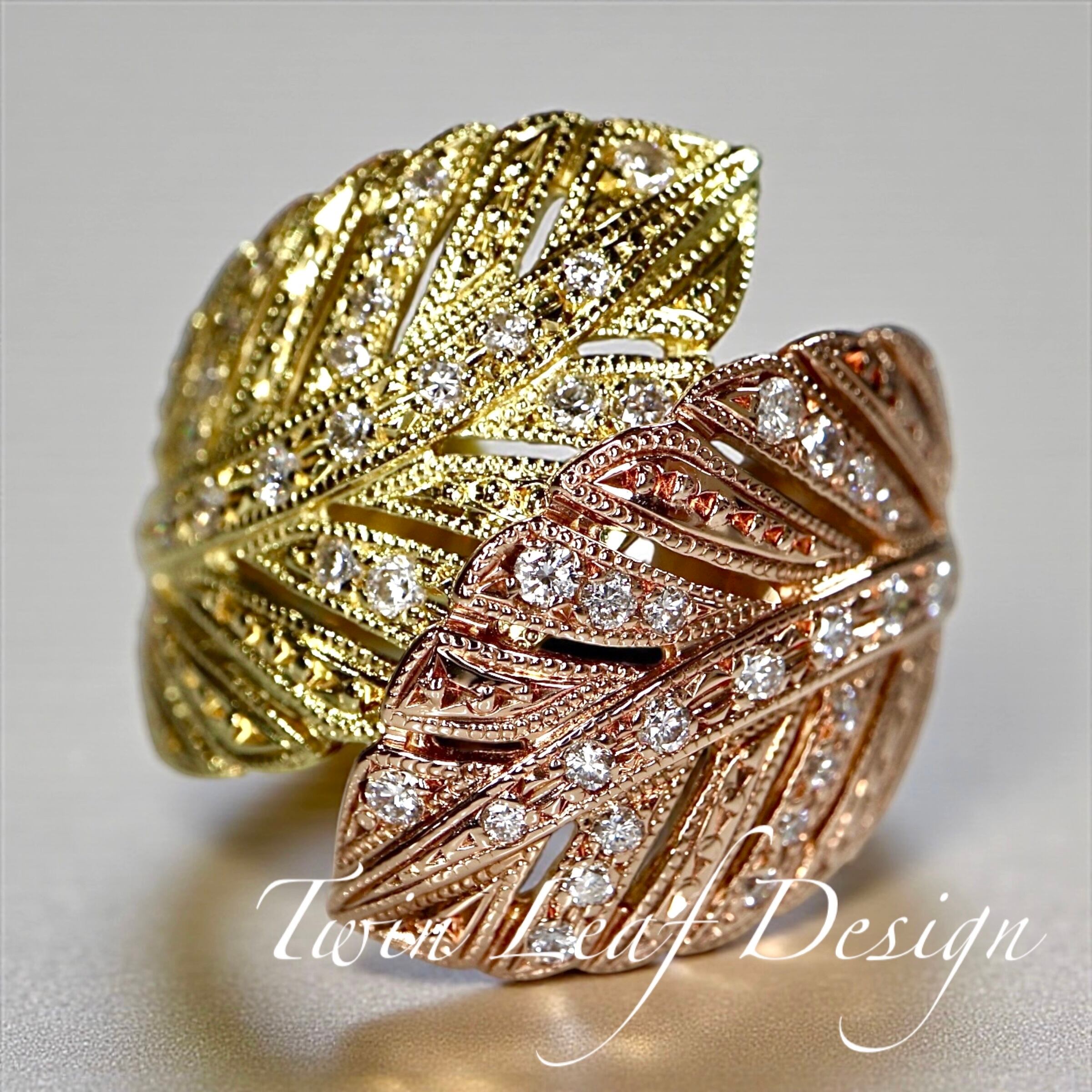 リーフデザインや羽の様にも見えて見るも着けるも非常に美しいリングです。