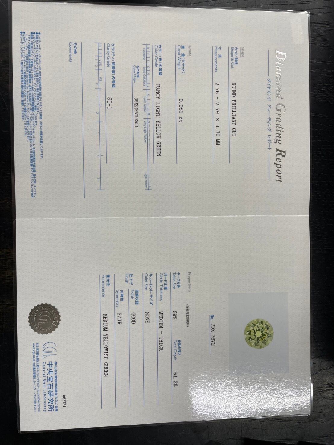 ファンシーライトイエローグリーンダイヤモンドリング0.081ct