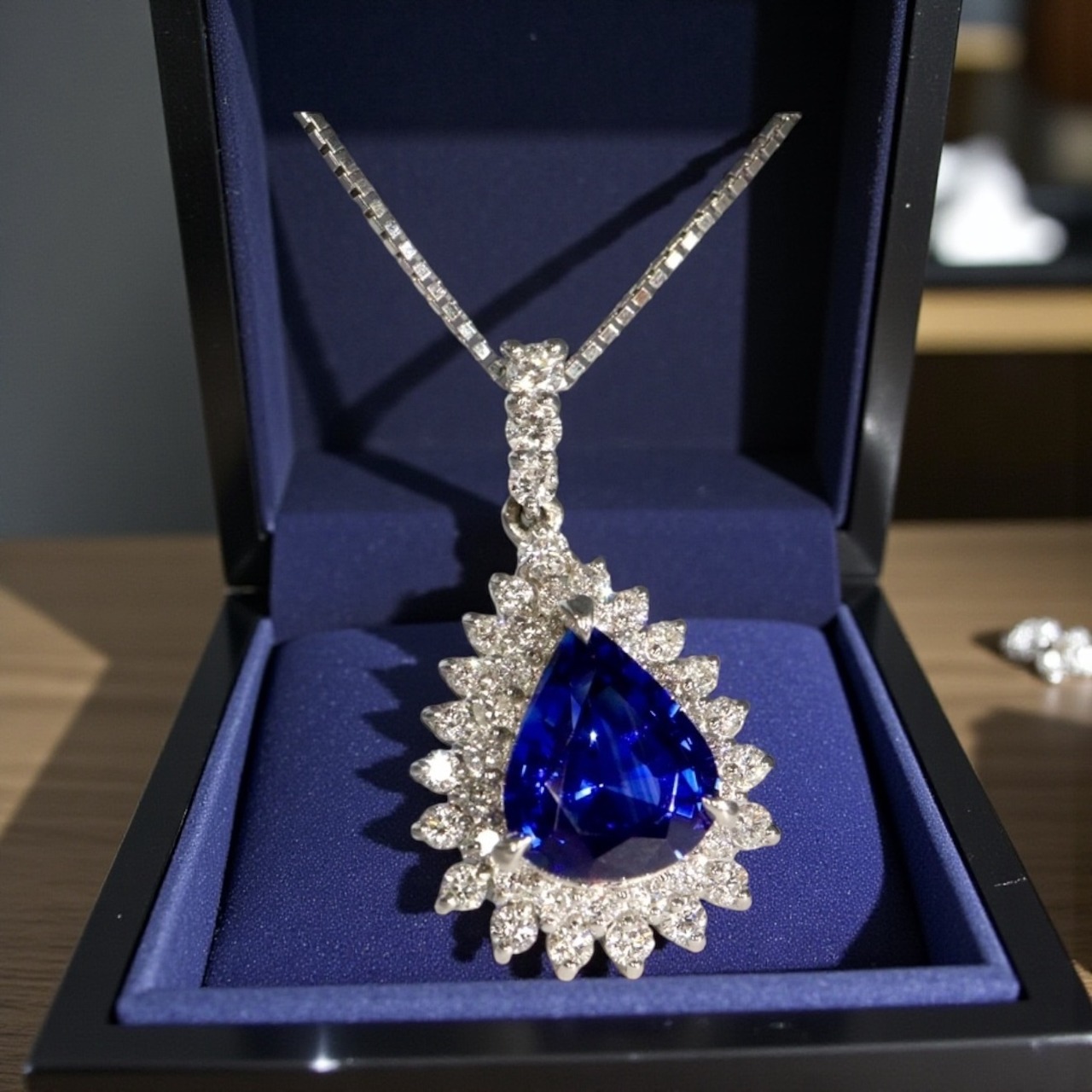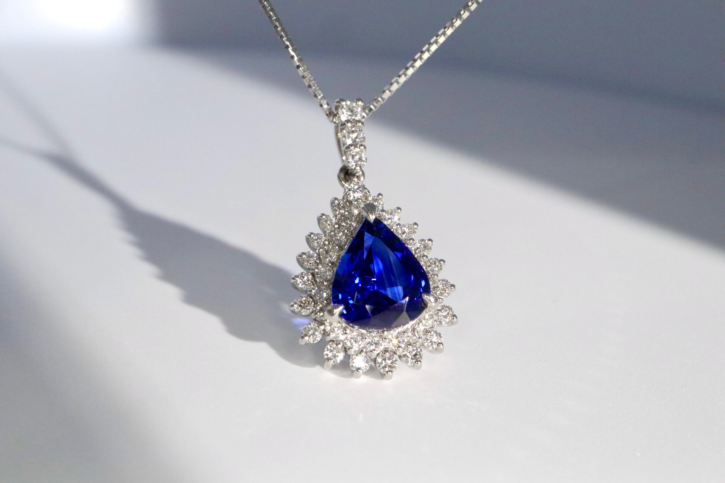 1.55ctの存在感あるサファイアを無色透明のダイヤモンドで二重に取り巻いたサンバーストデザインが顔まわりを明るく華やかに見せてくれるネックレスです。