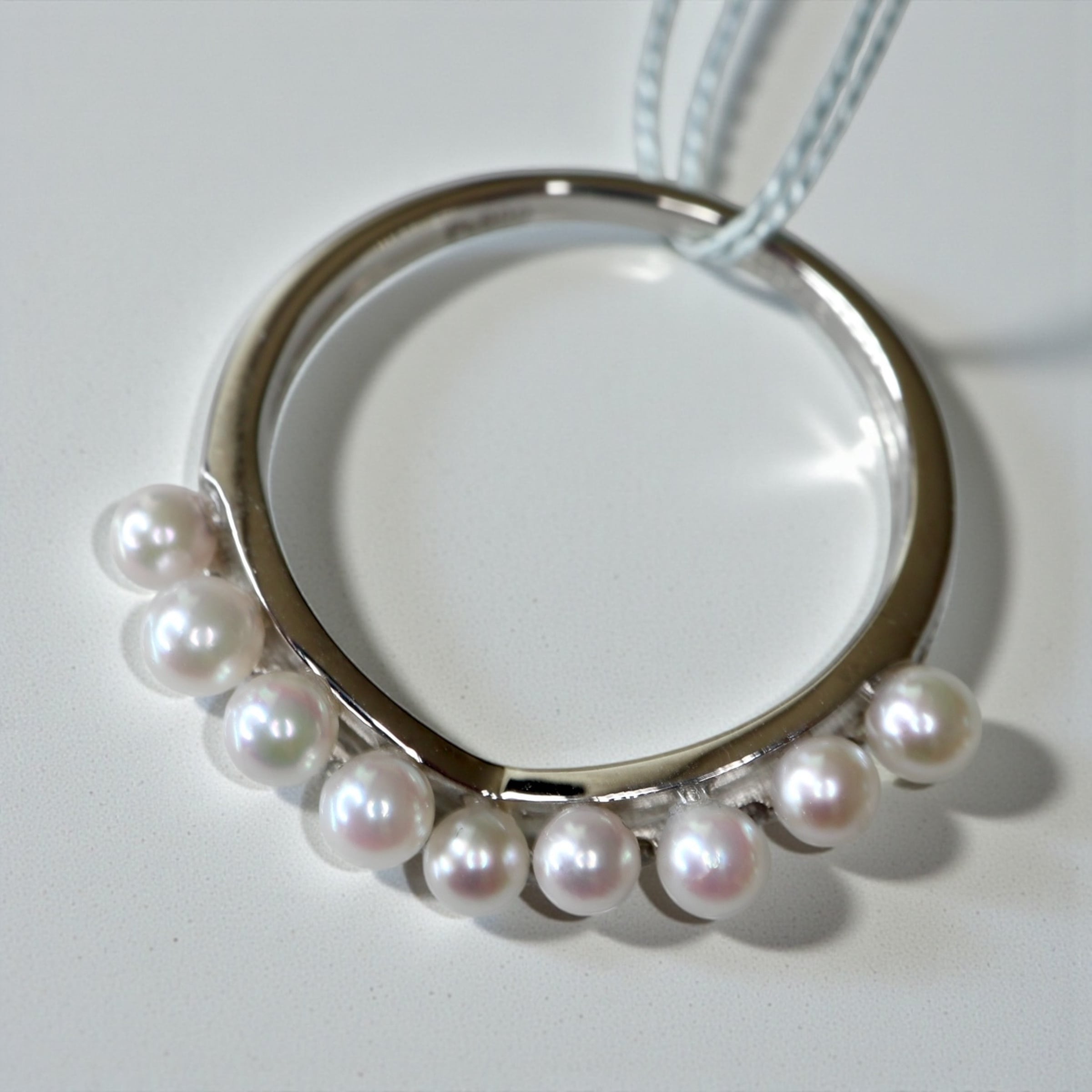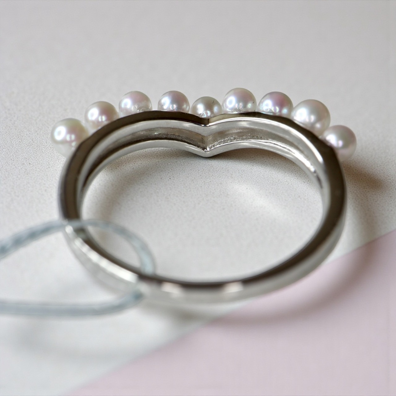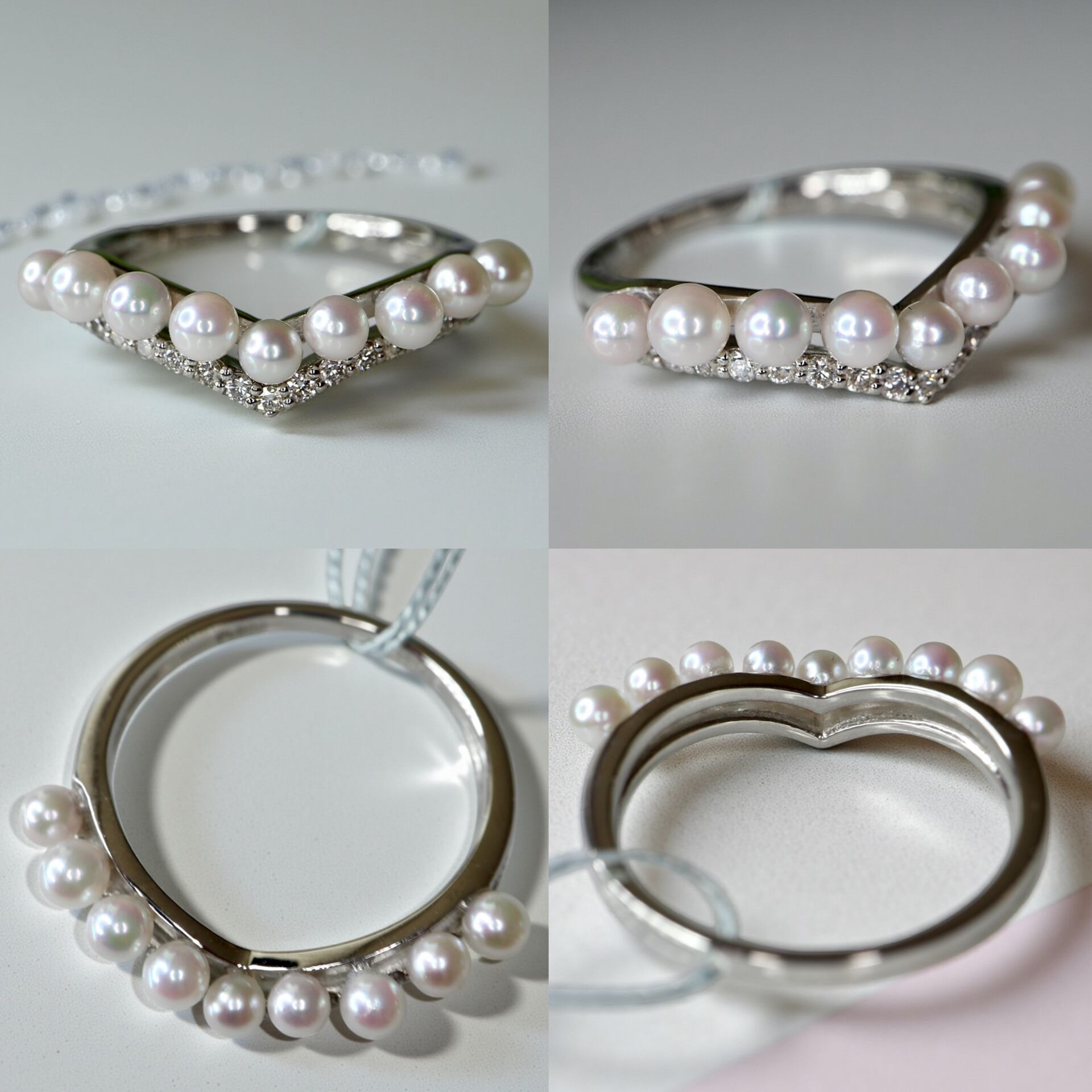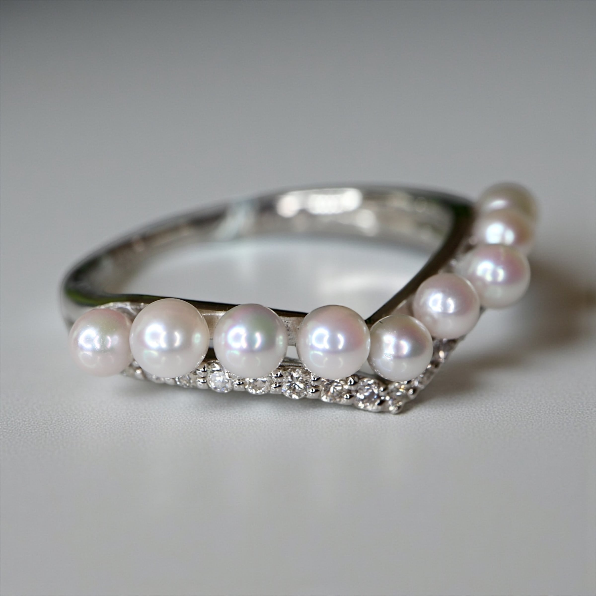 キュッとお指を美しく魅せるV字ラインに枠3ミリサイズのアコヤベビーパール一粒ずつ丁寧にセレクションしセッティングした非常に美しいリング。