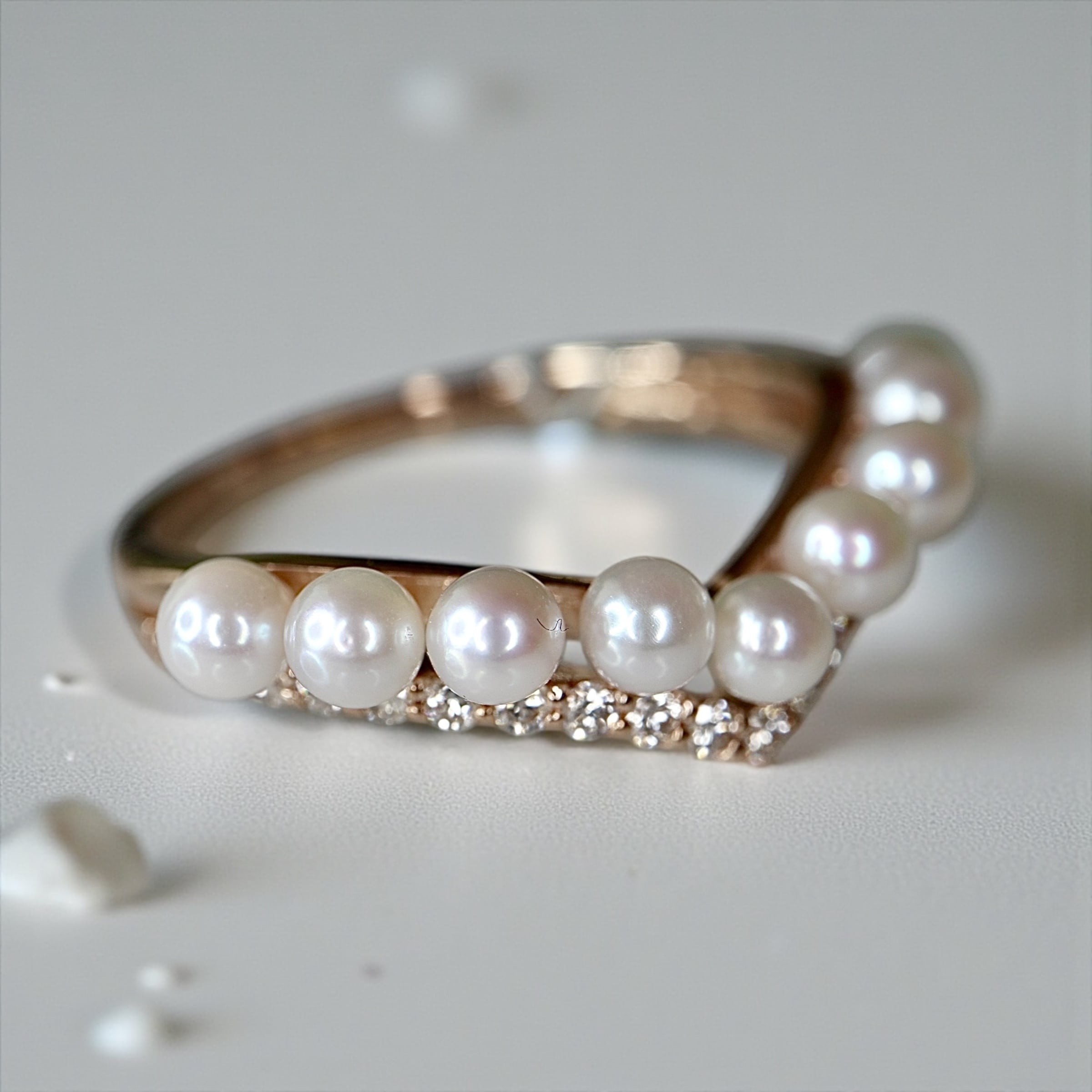 キュッとお指を美しく魅せるV字ラインに枠3ミリサイズのアコヤベビーパール一粒ずつ丁寧にセレクションしセッティングした非常に美しいリング。