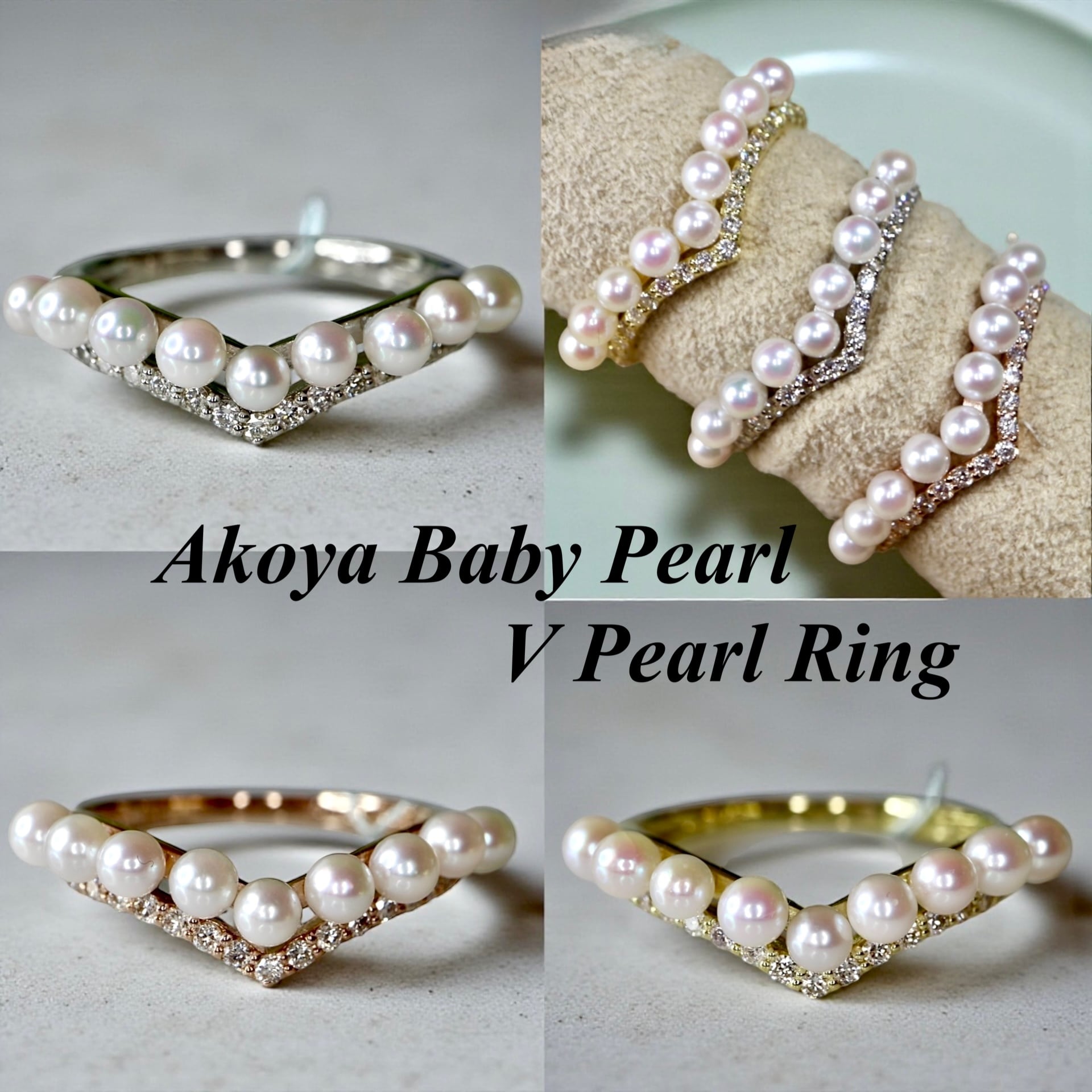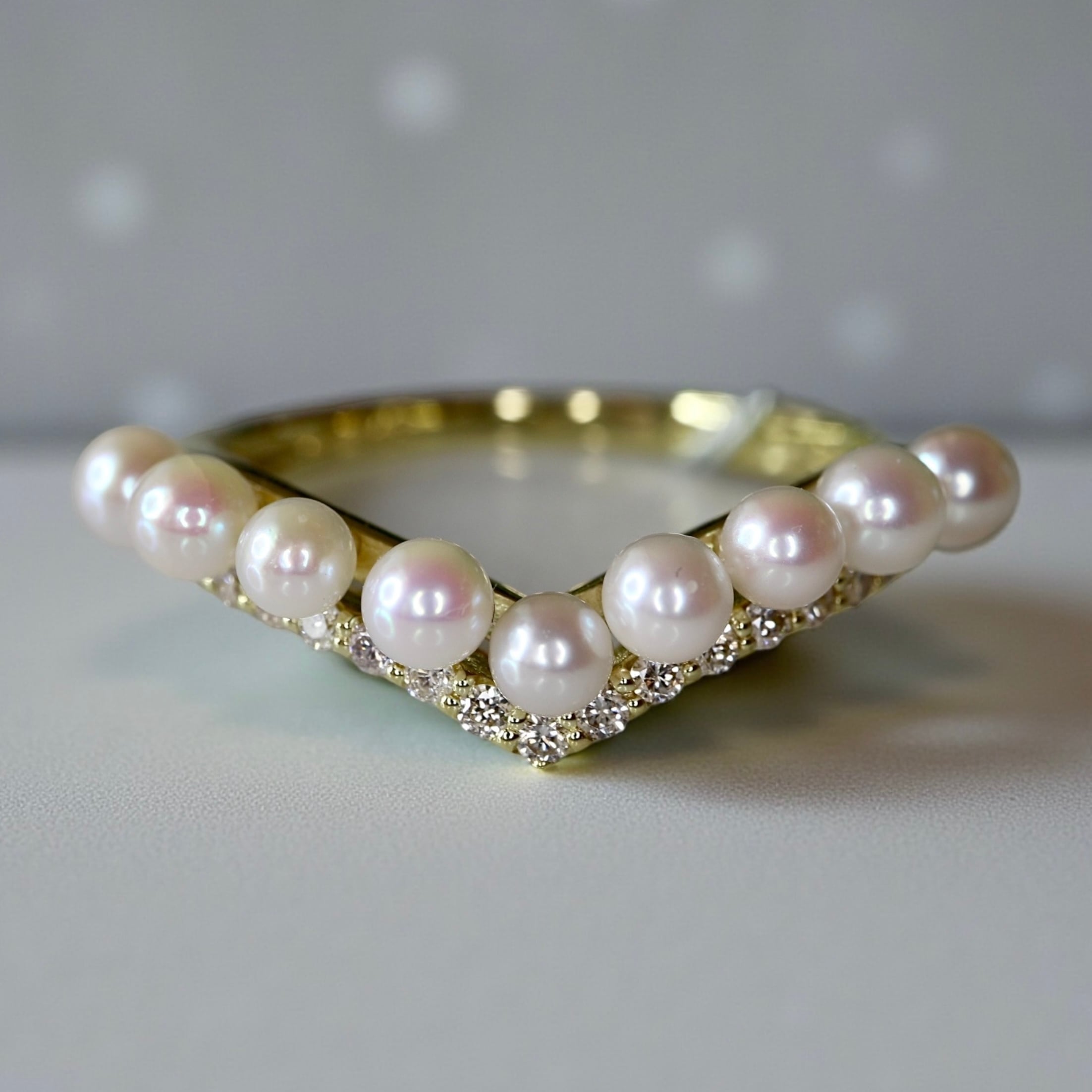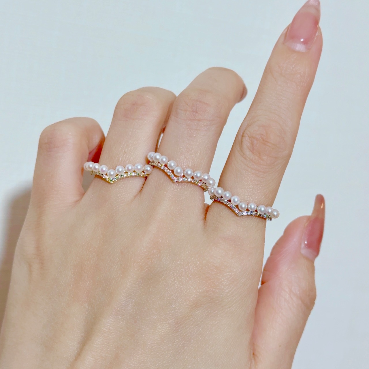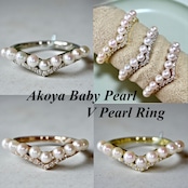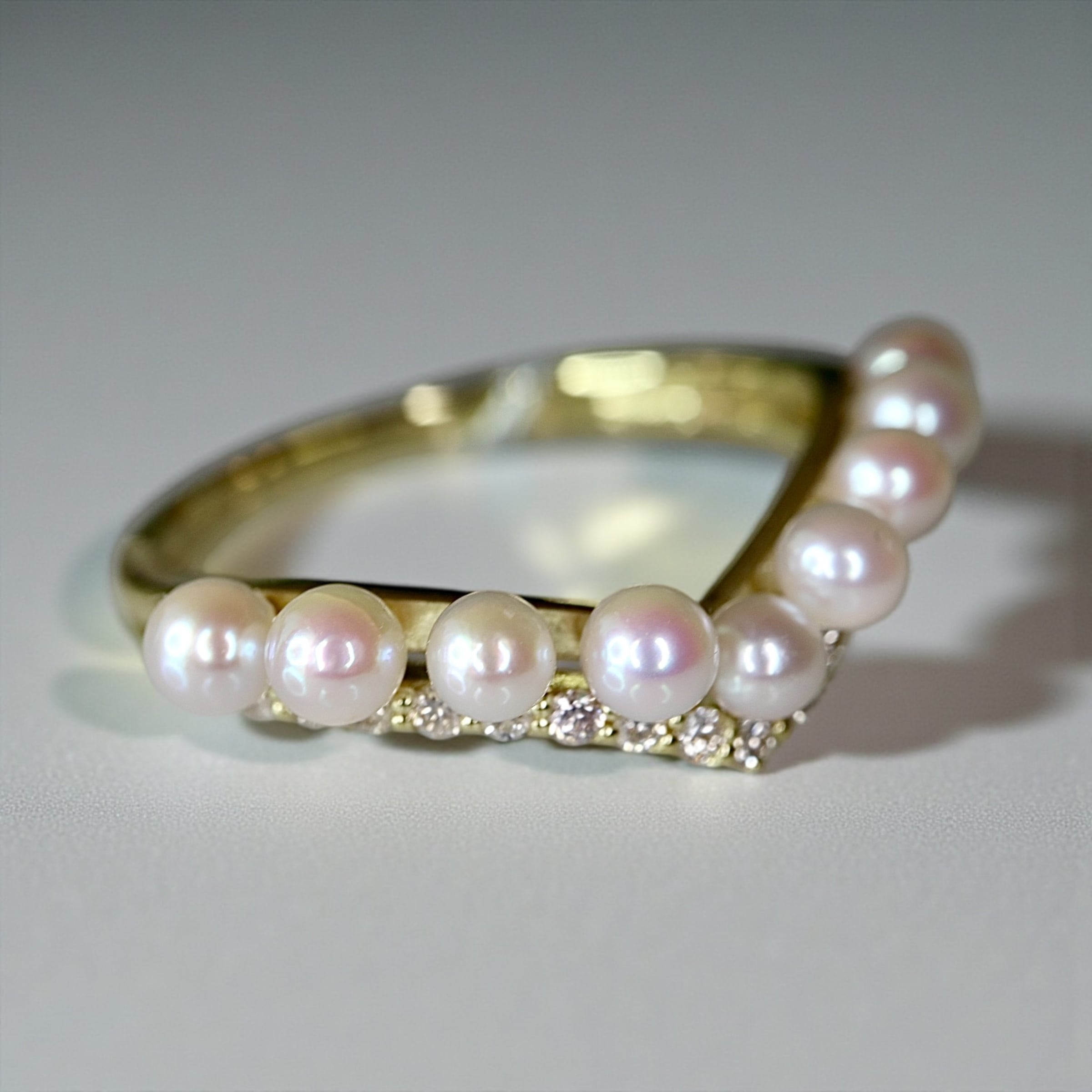 キュッとお指を美しく魅せるV字ラインに枠3ミリサイズのアコヤベビーパール一粒ずつ丁寧にセレクションしセッティングした非常に美しいリング。