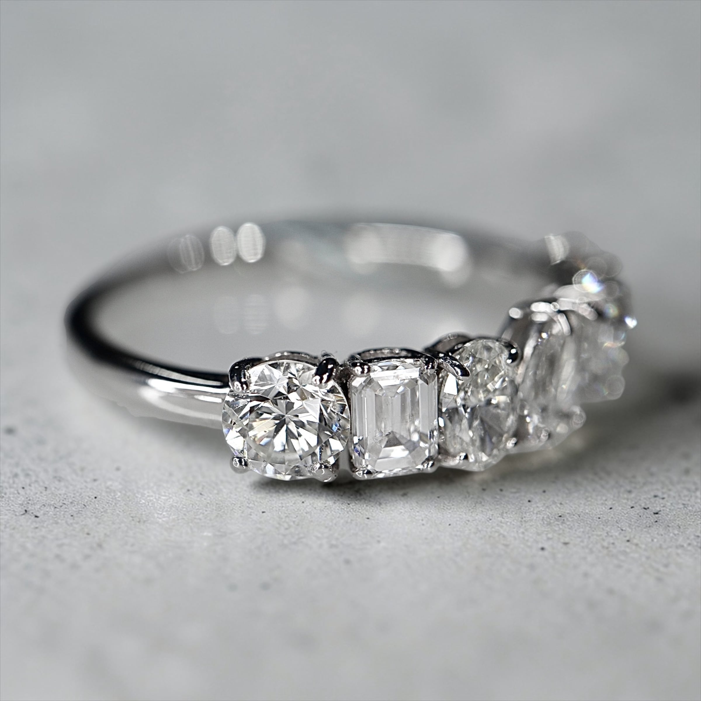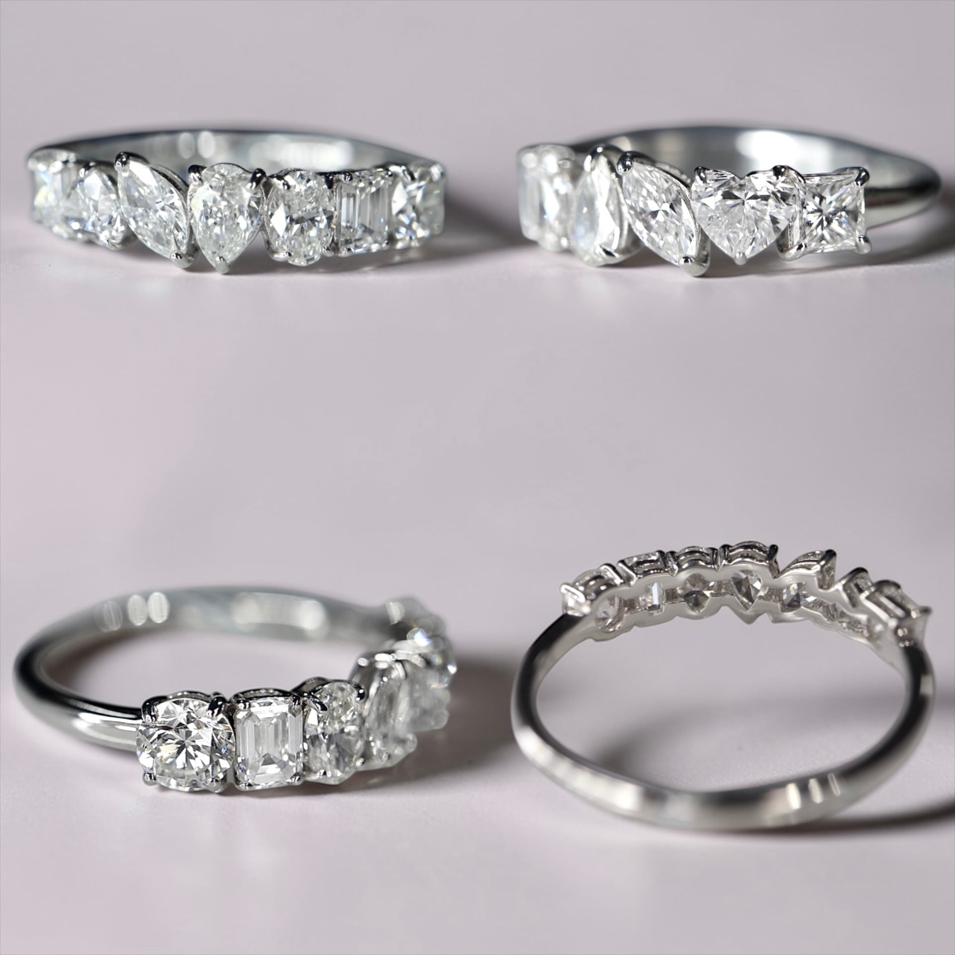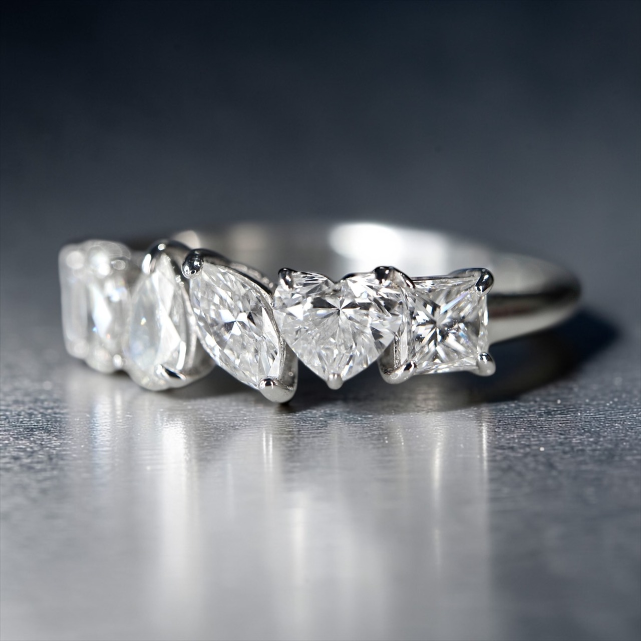 ラウンド・エメラルド・ペア・マーキス・ハート・プリンセスと複数のシェイプをリズミカルに並べたトレンド感のあるマルチシェイプデザイン。