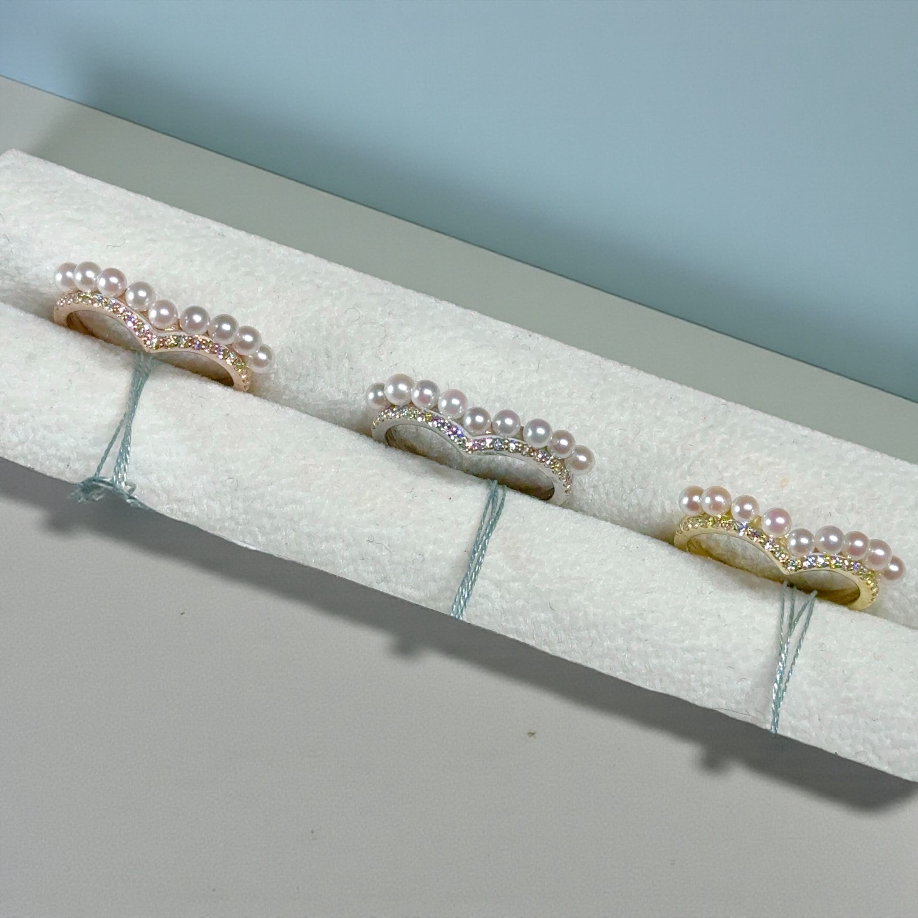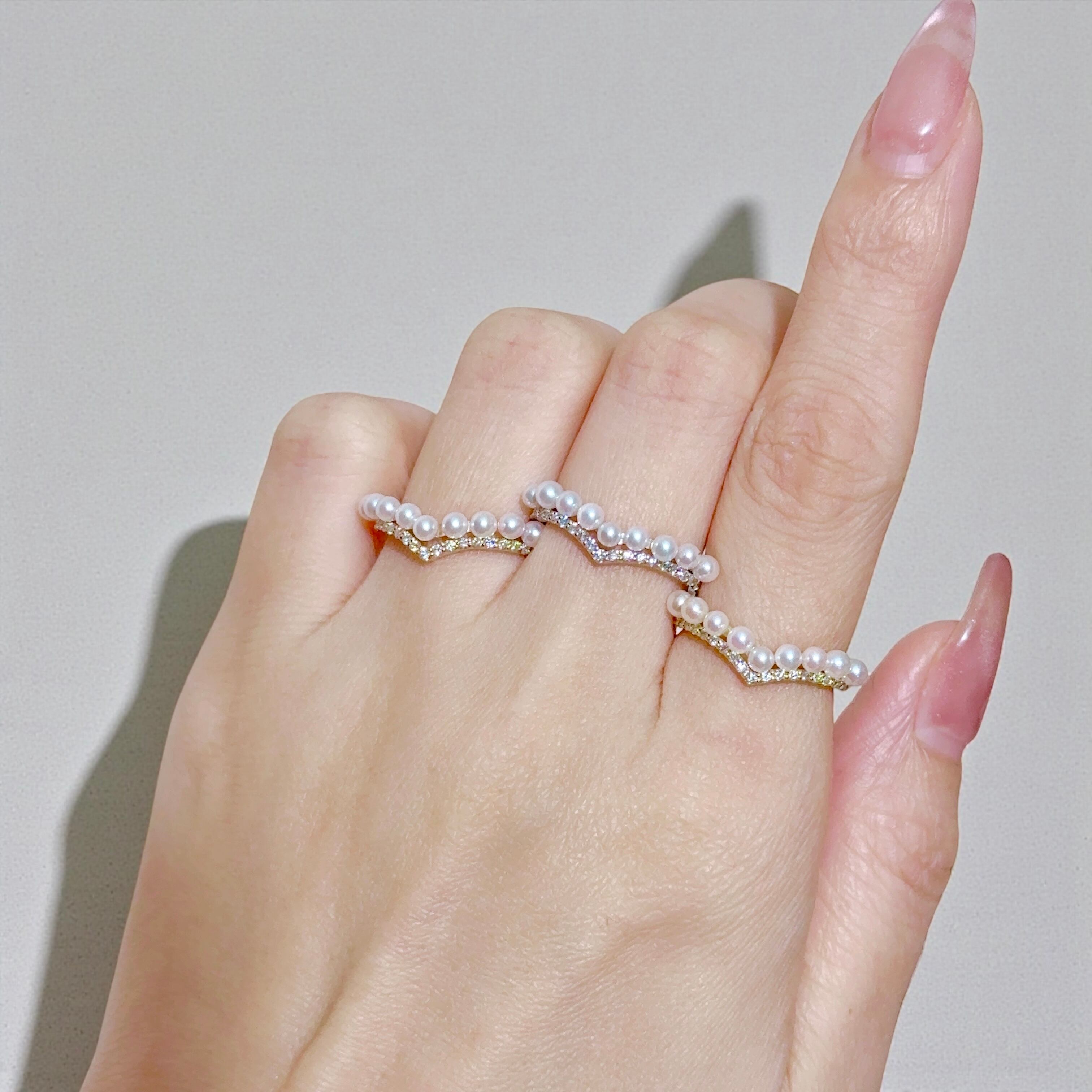 アコヤベビーパールを贅沢に並べた緩Vシルエットのリングが新しくお目見えです。