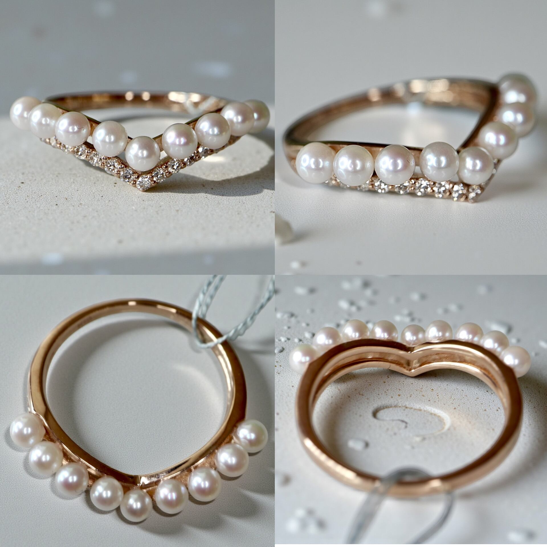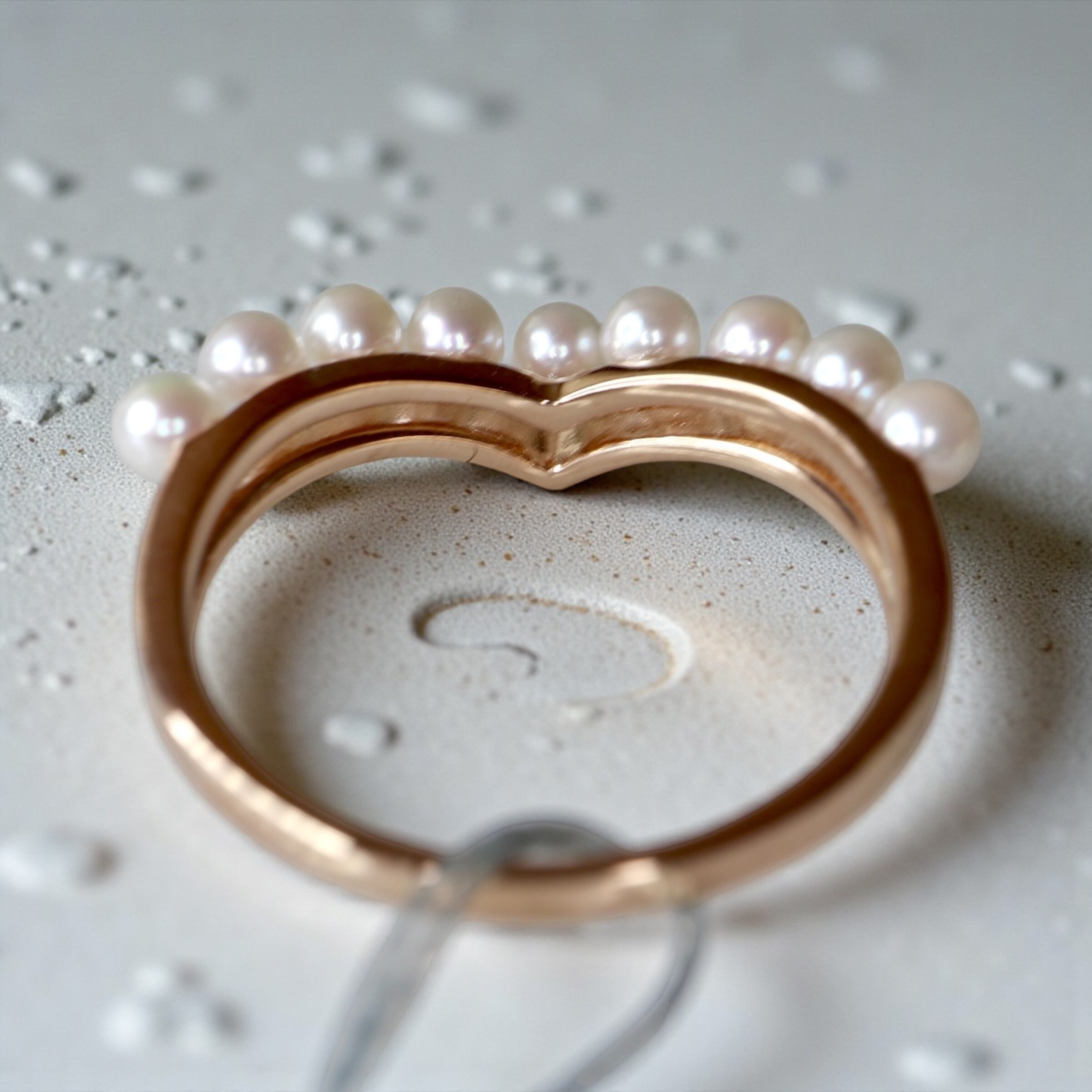 キュッとお指を美しく魅せるV字ラインに枠3ミリサイズのアコヤベビーパール一粒ずつ丁寧にセレクションしセッティングした非常に美しいリング。