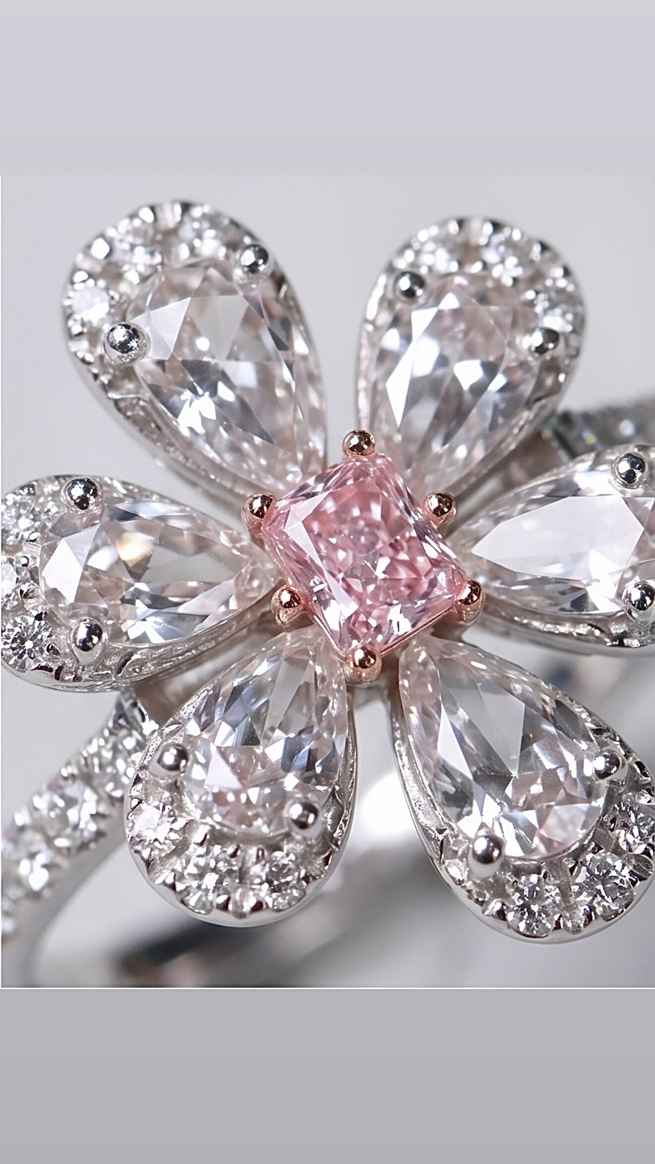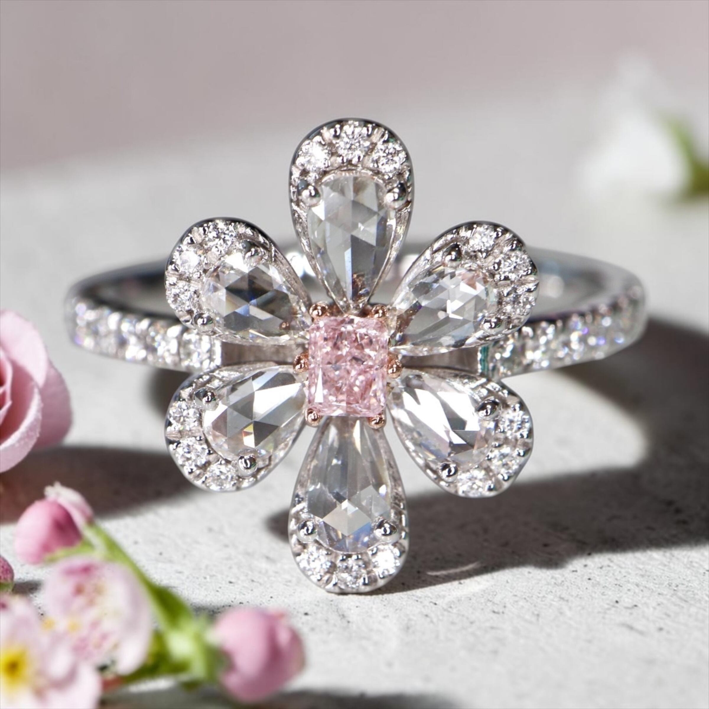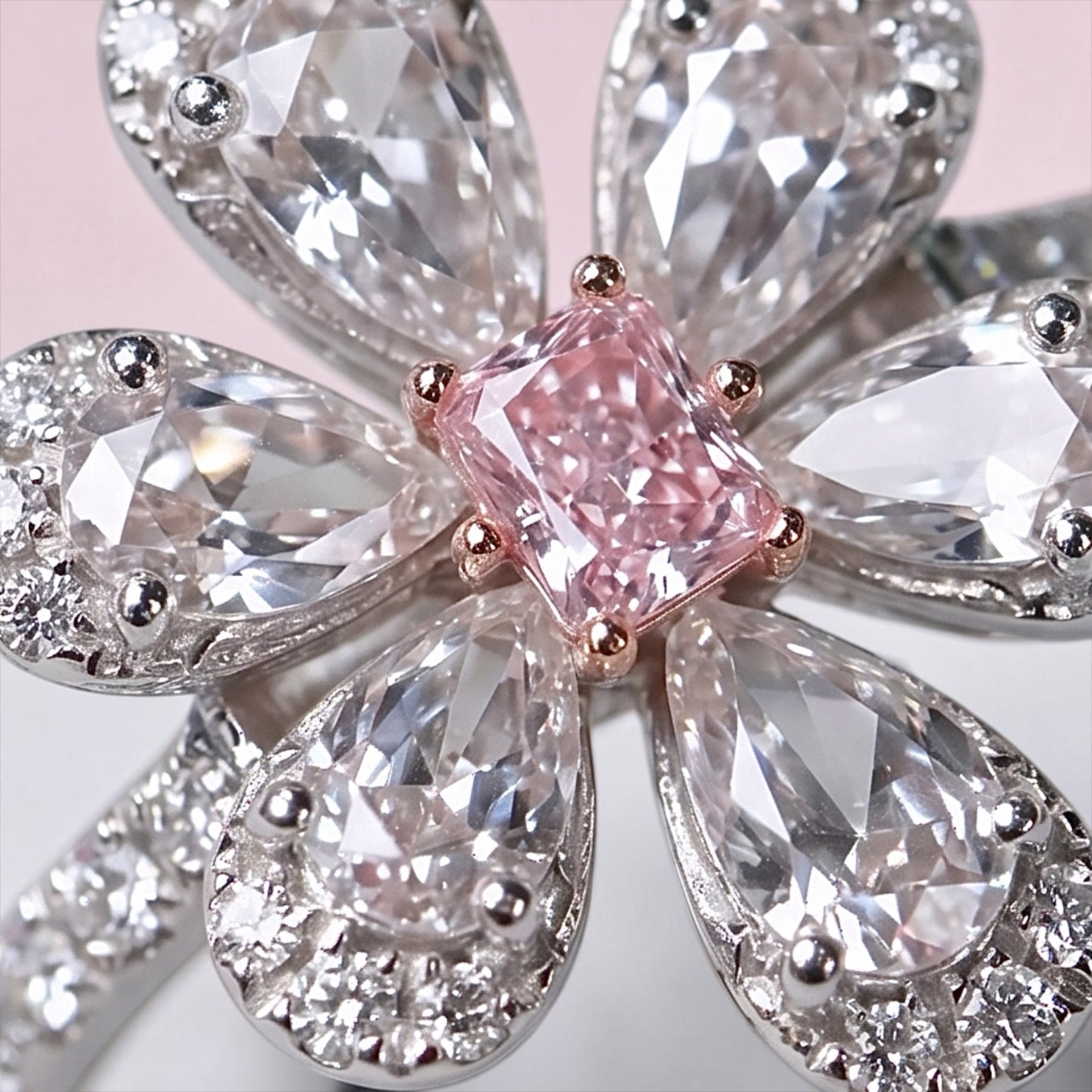 センターのファンシーピンクダイヤモンドは満開の1番美しい時の桜のよう。