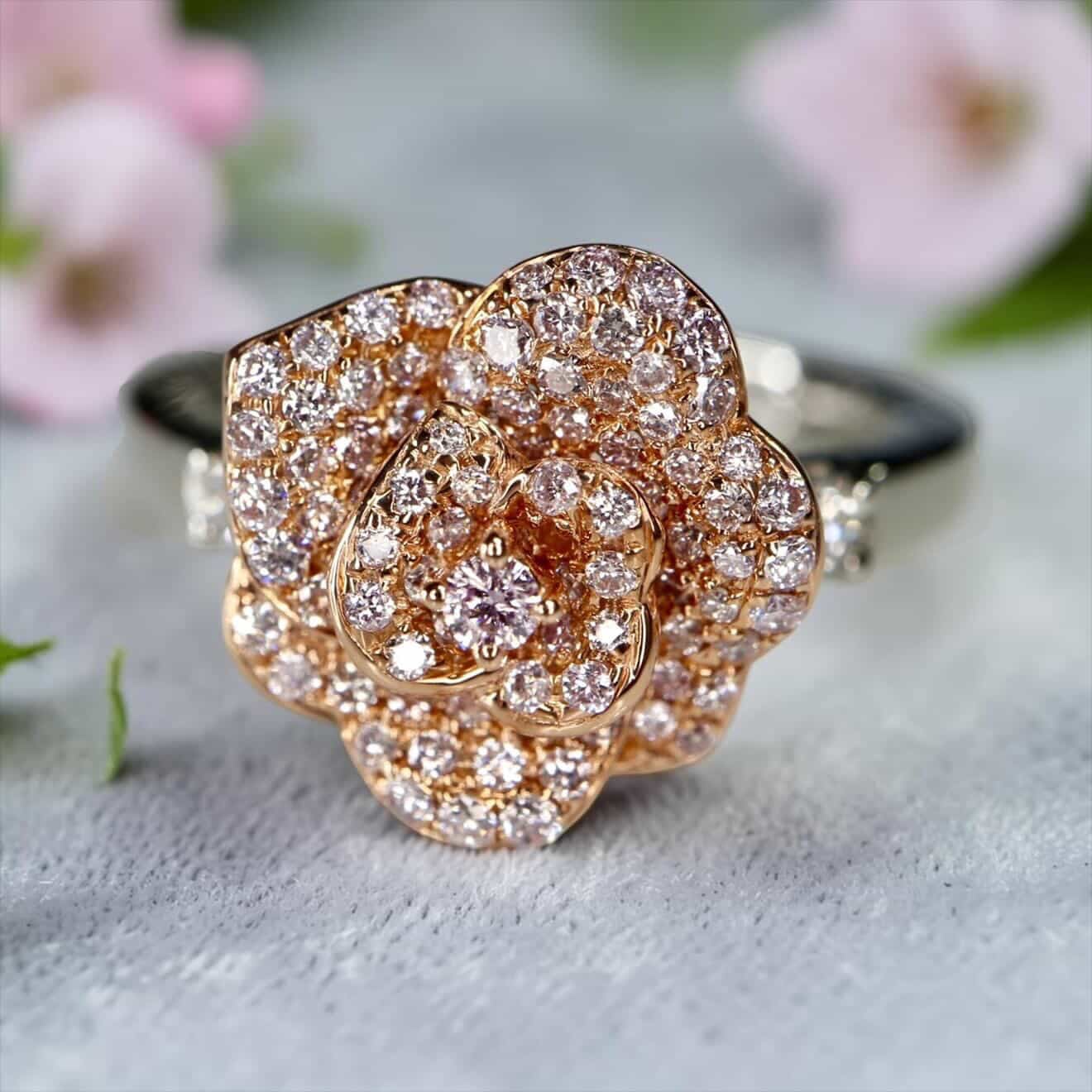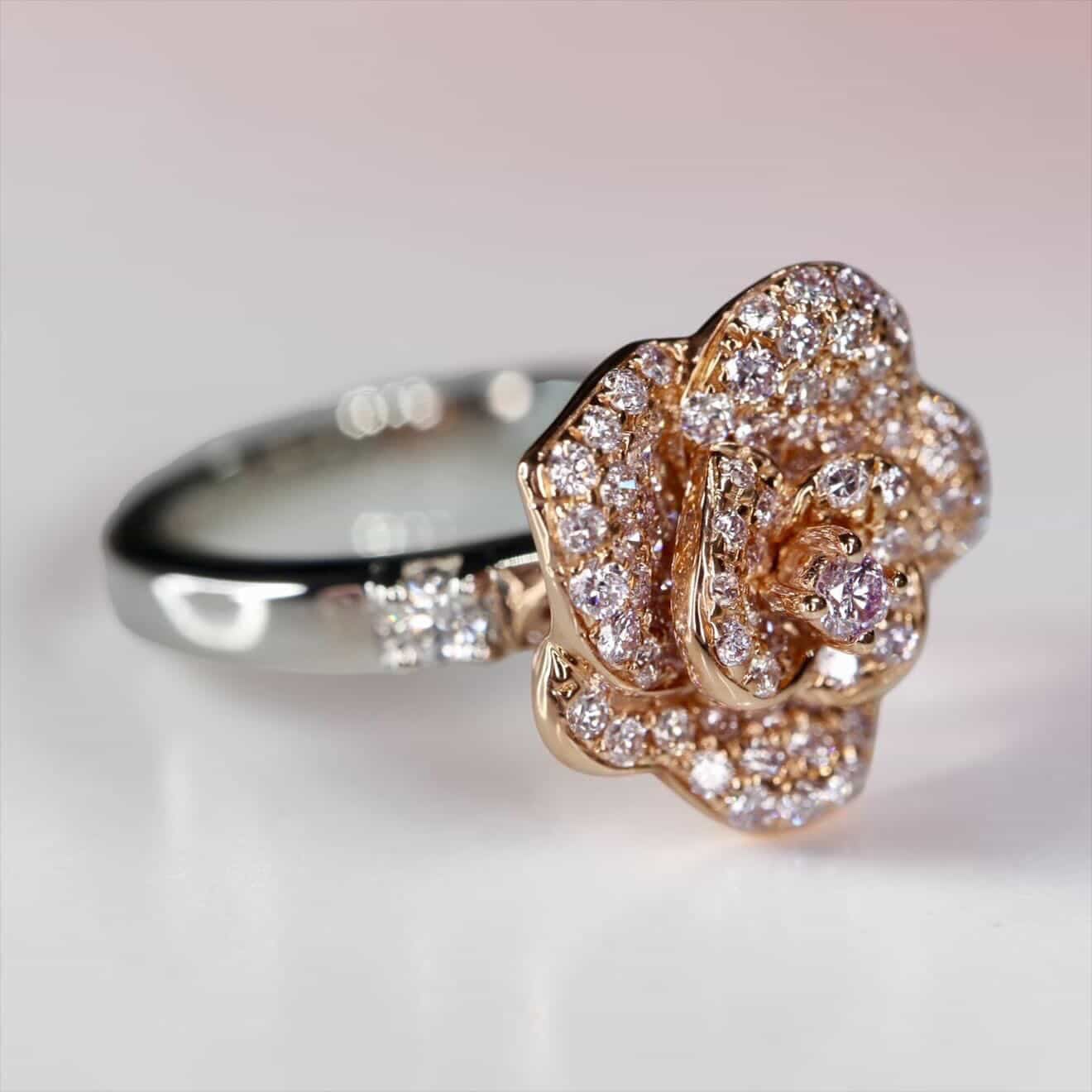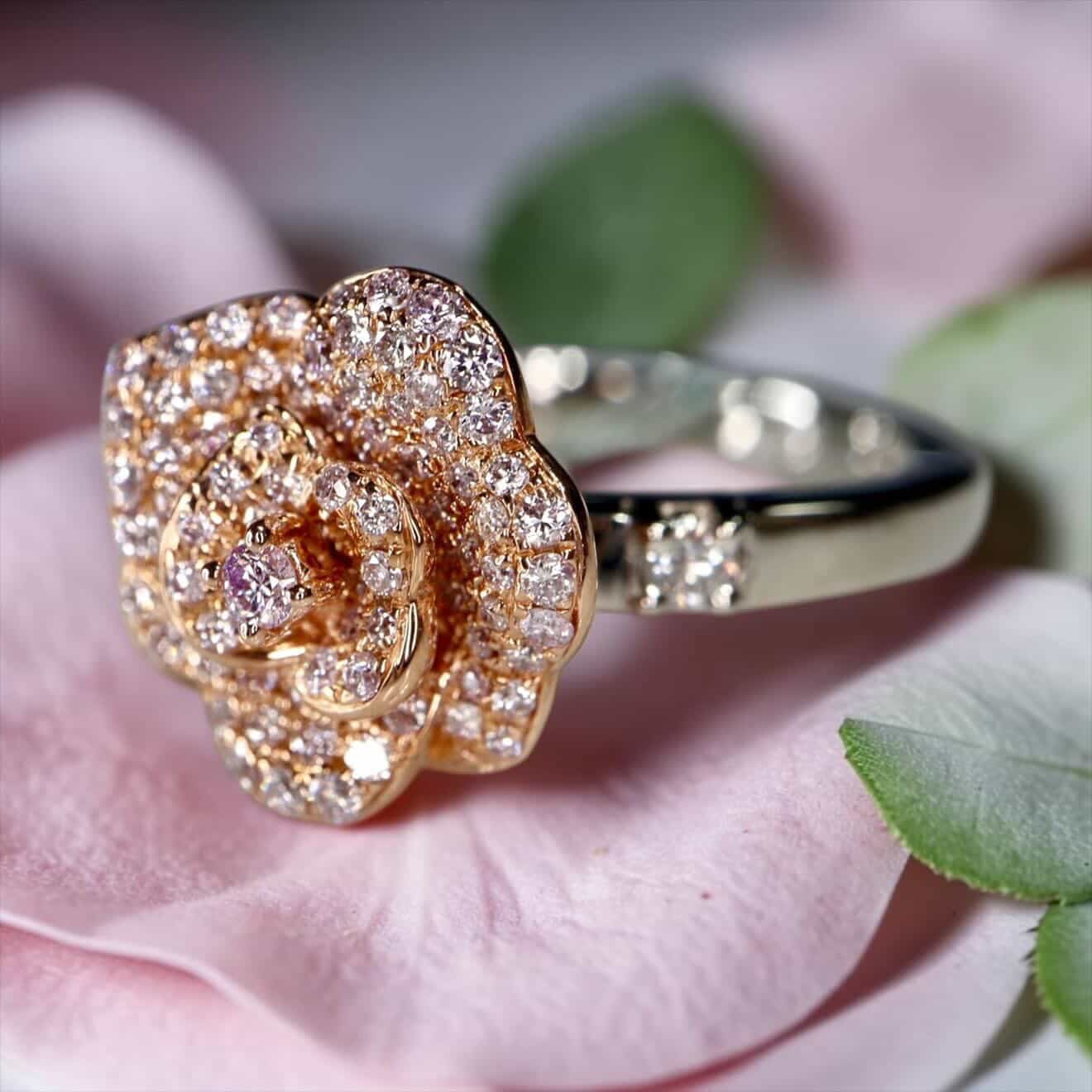 繊細な花びら一枚一枚に明るめのナチュラルピンクダイヤモンドとびっしりと敷き詰めたローズデザインリング。