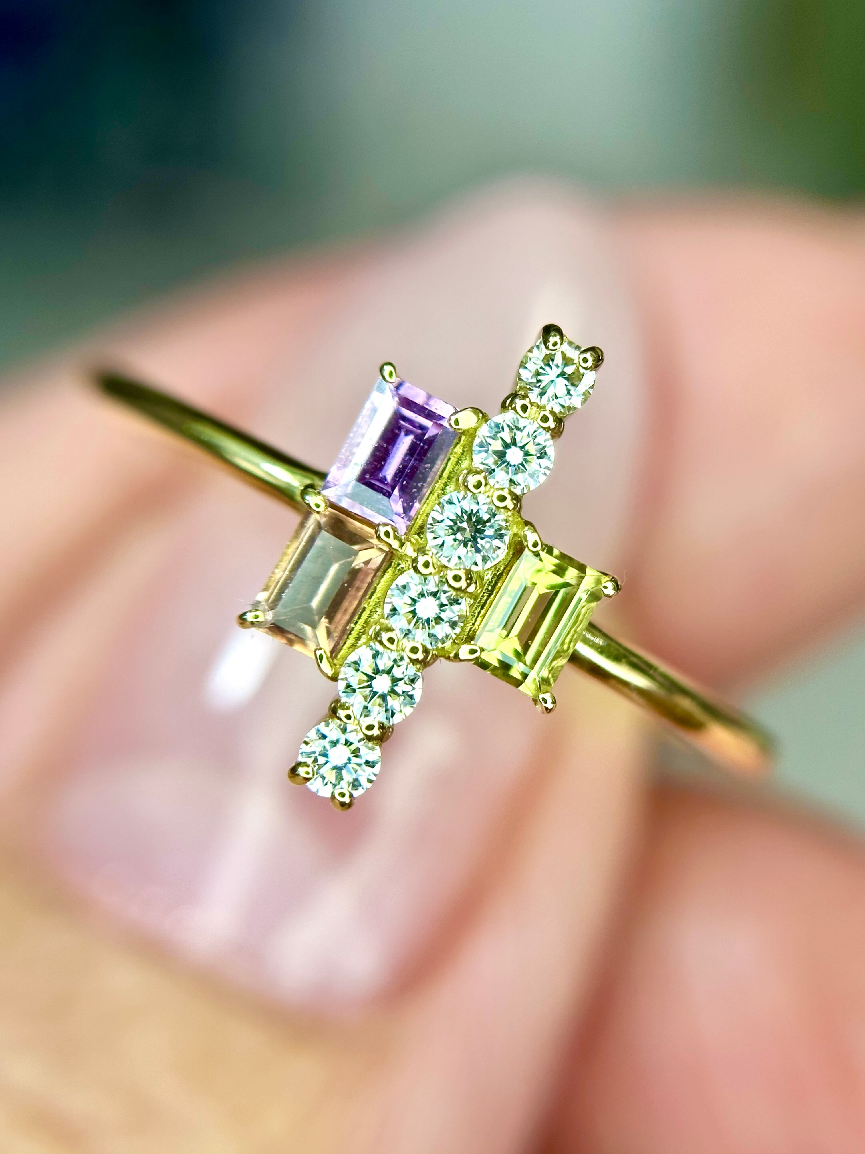 K18イエローゴールドにピンクサファイア、パープルサファイア、イエローサファイアを組み合わせてセンターには高品質のダイヤモンド。