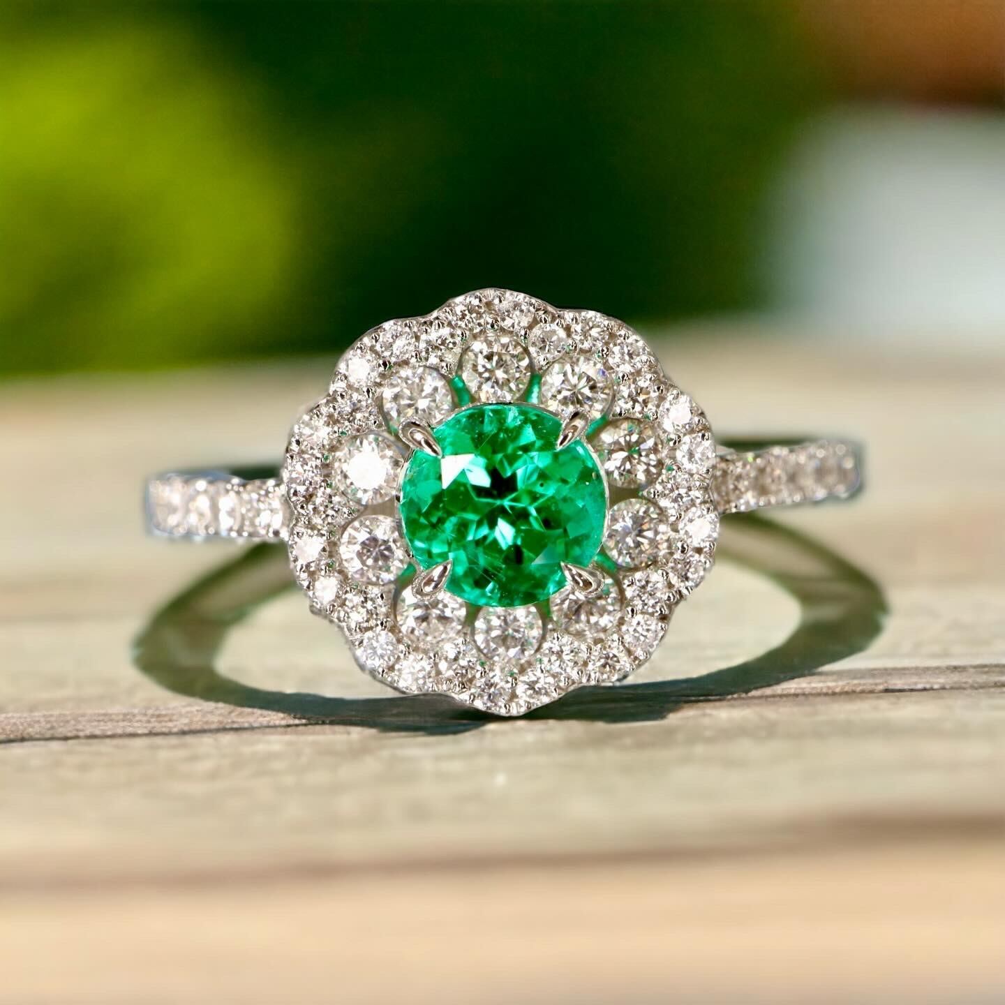 美しいラウンドカットノンオイルエメラルドの周りにはダイヤモンドの粒感や華やかな輝きをたっぷり感じるレースのような透かしデザイン✨