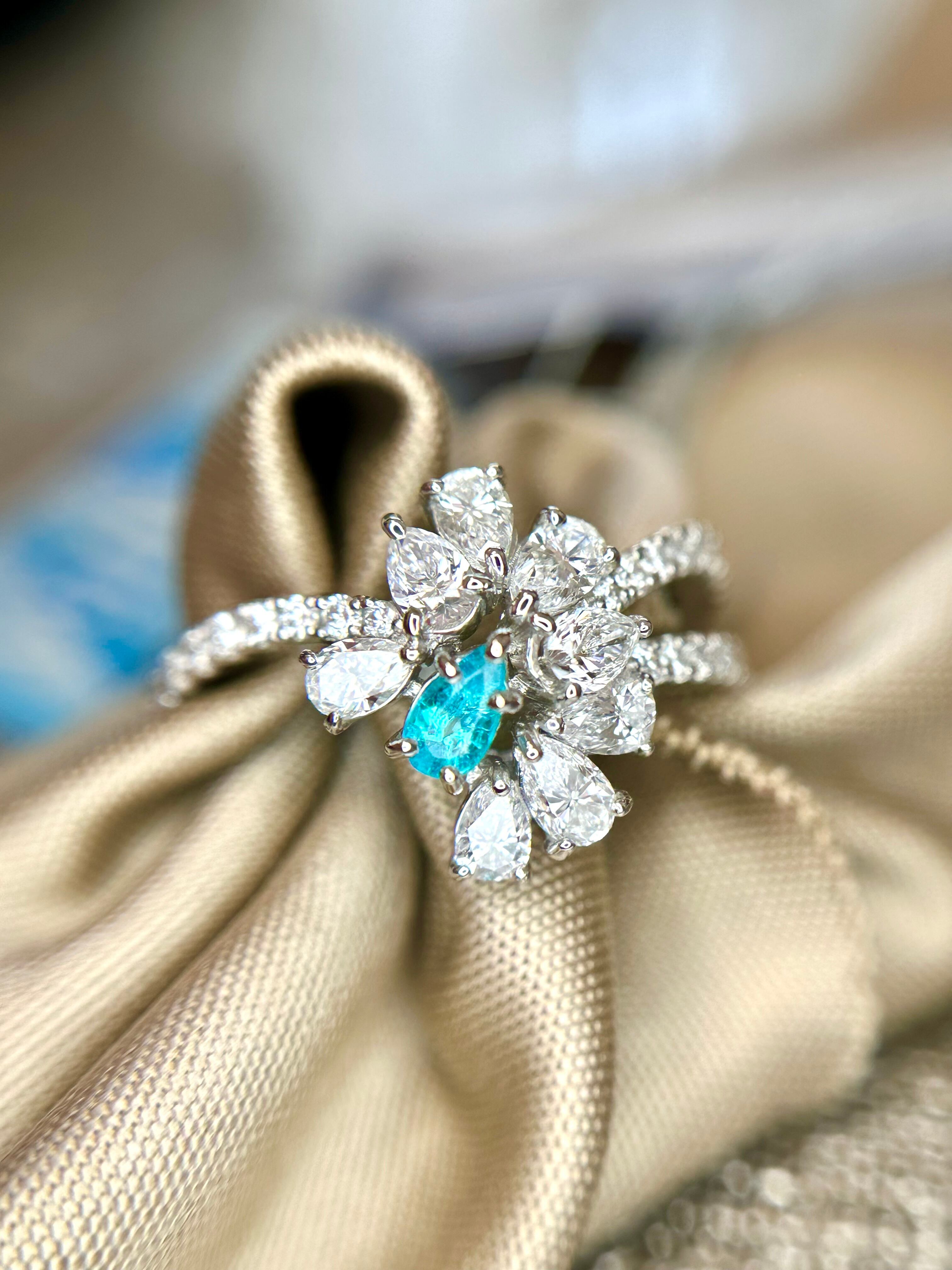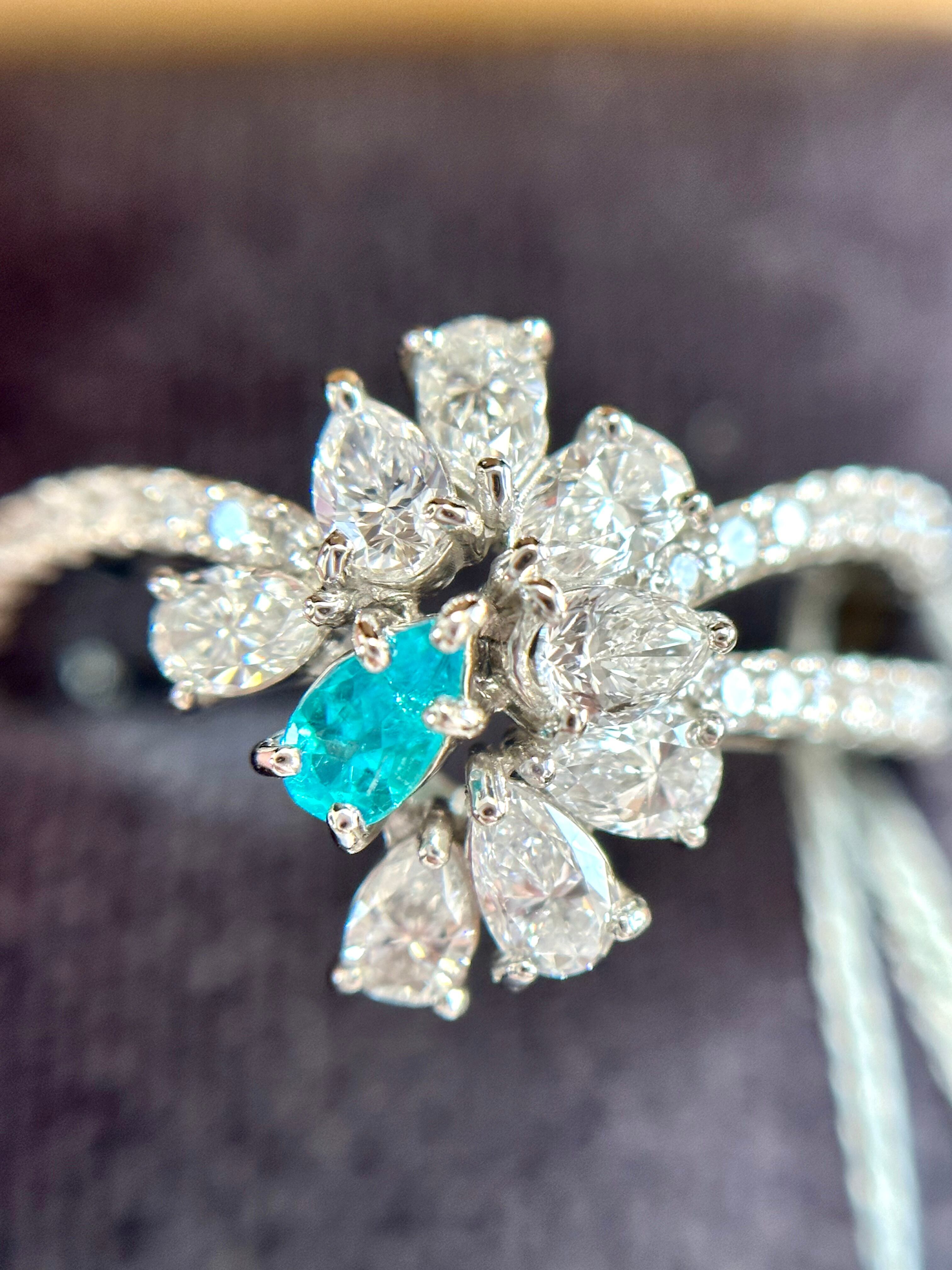 白く美しいダイヤモンドど主石の青いブラジル産パライバトルマリンの相性をさらに際立たせ調和の高い抜群の組み合わせです。