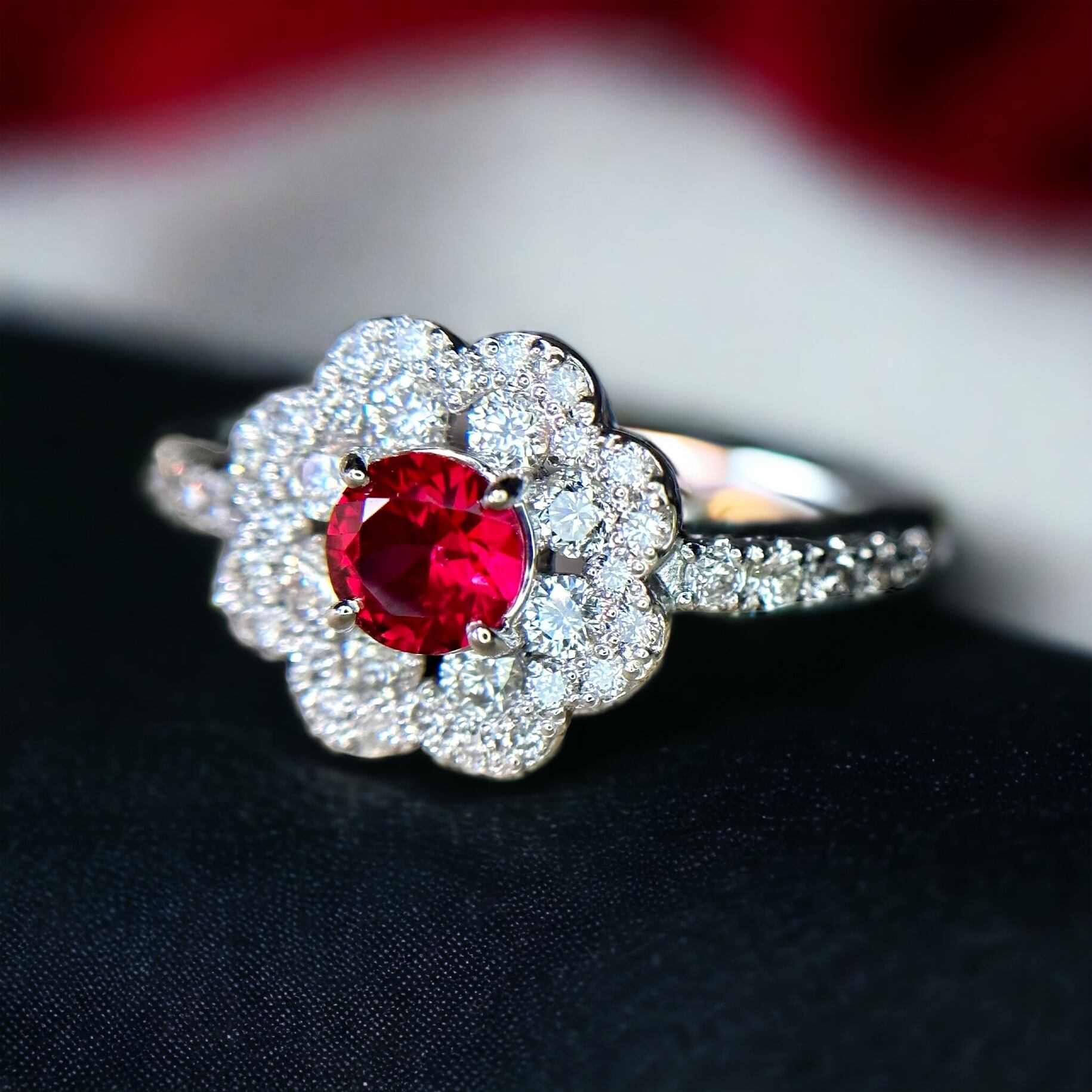 ダイヤモンドの美しさが真紅に輝く高品質ノーヒートピジョンブラッドルビ一の美しさを最大に引き上げています。