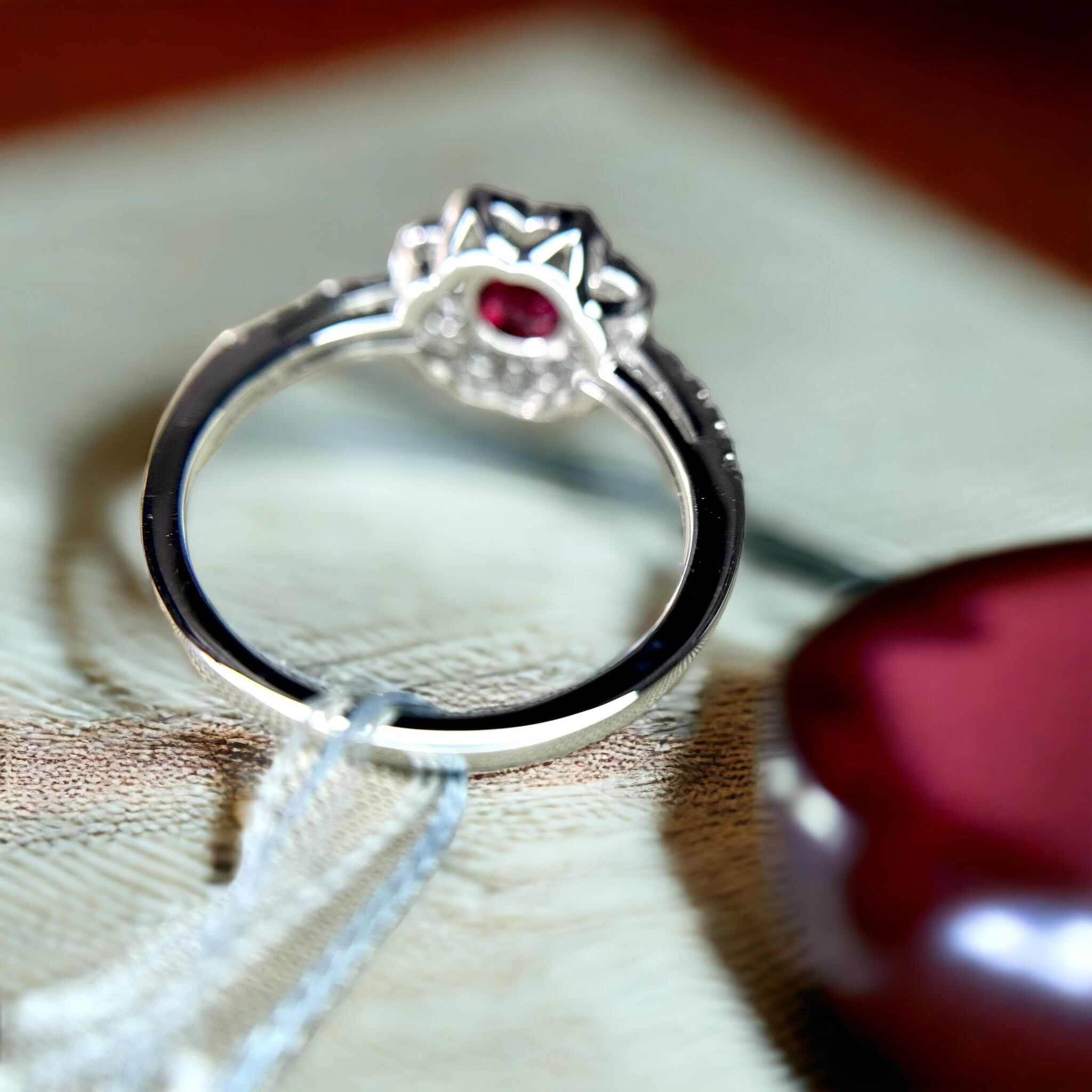 ピジョンブラッドルビーの赤い輝きを最大に引き立てたとっておきの1本です。