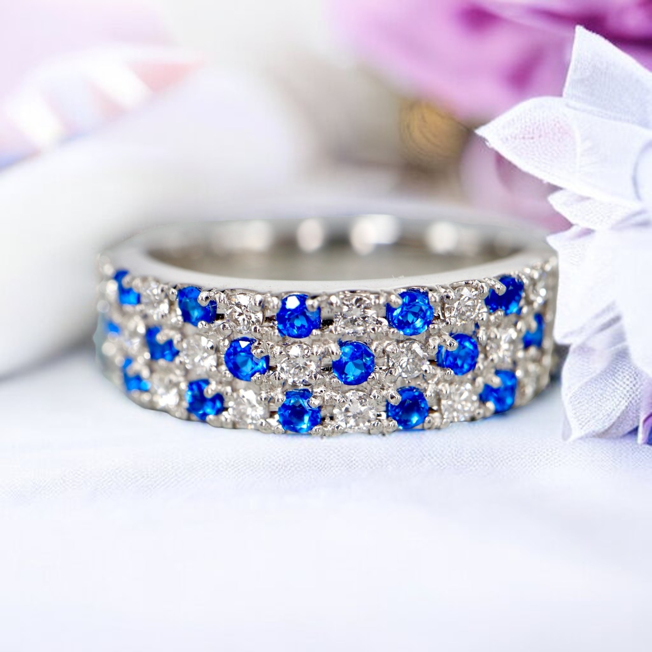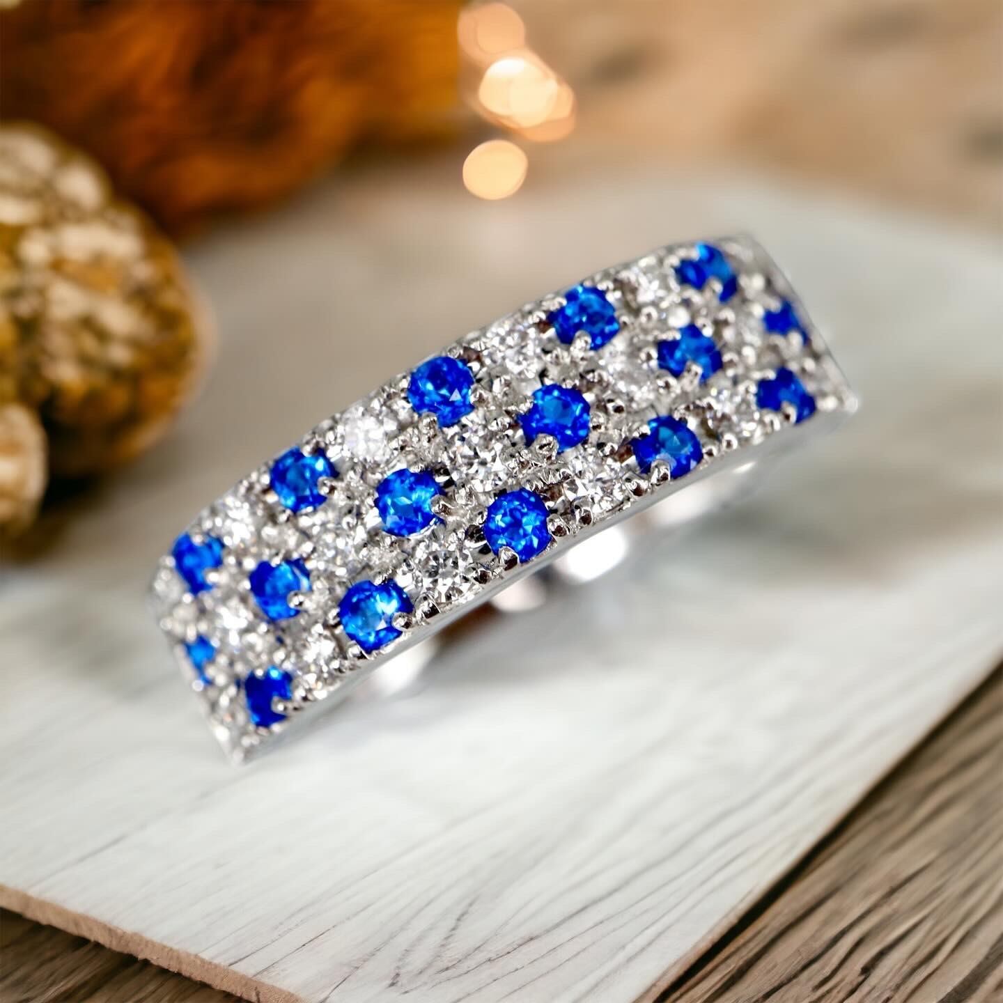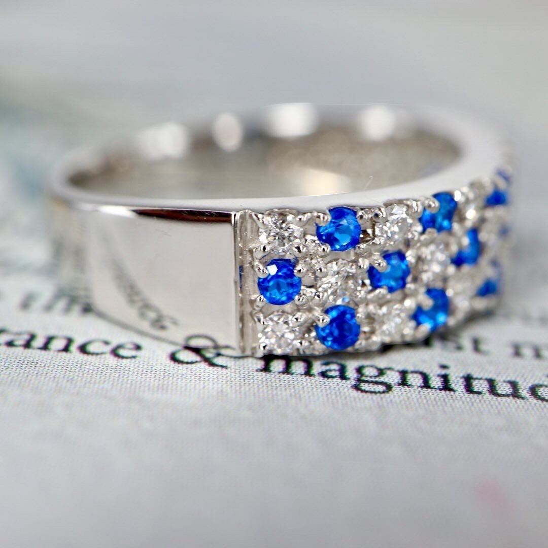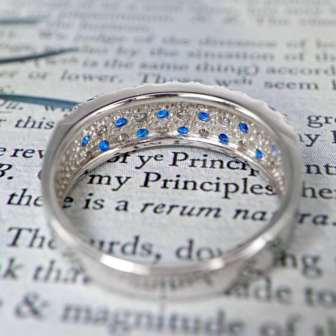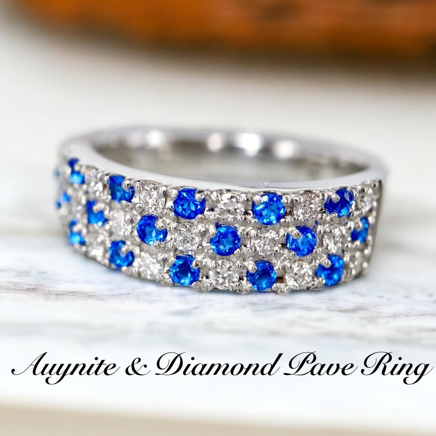 アウイナイトな青はフェルメールブルーやコバルトブルーとも呼ばれますがこのリング1本全て煌めきも色味も合わせられています。