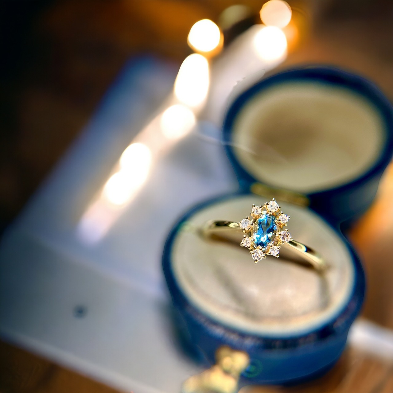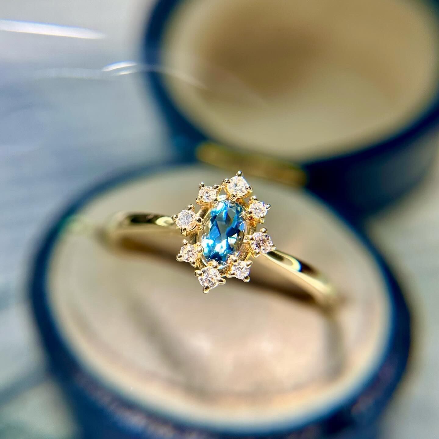 そんなサンタマリアアクアマリンに粒感のあるダイヤモンドのお仕立てで取り巻き濃厚なブルーにダイヤモンド輝きを添えています。