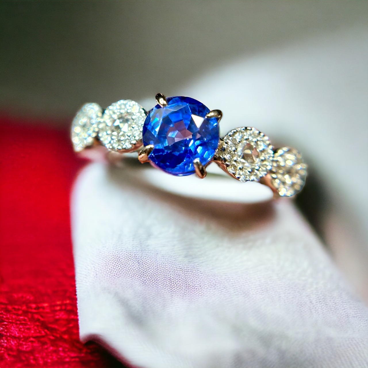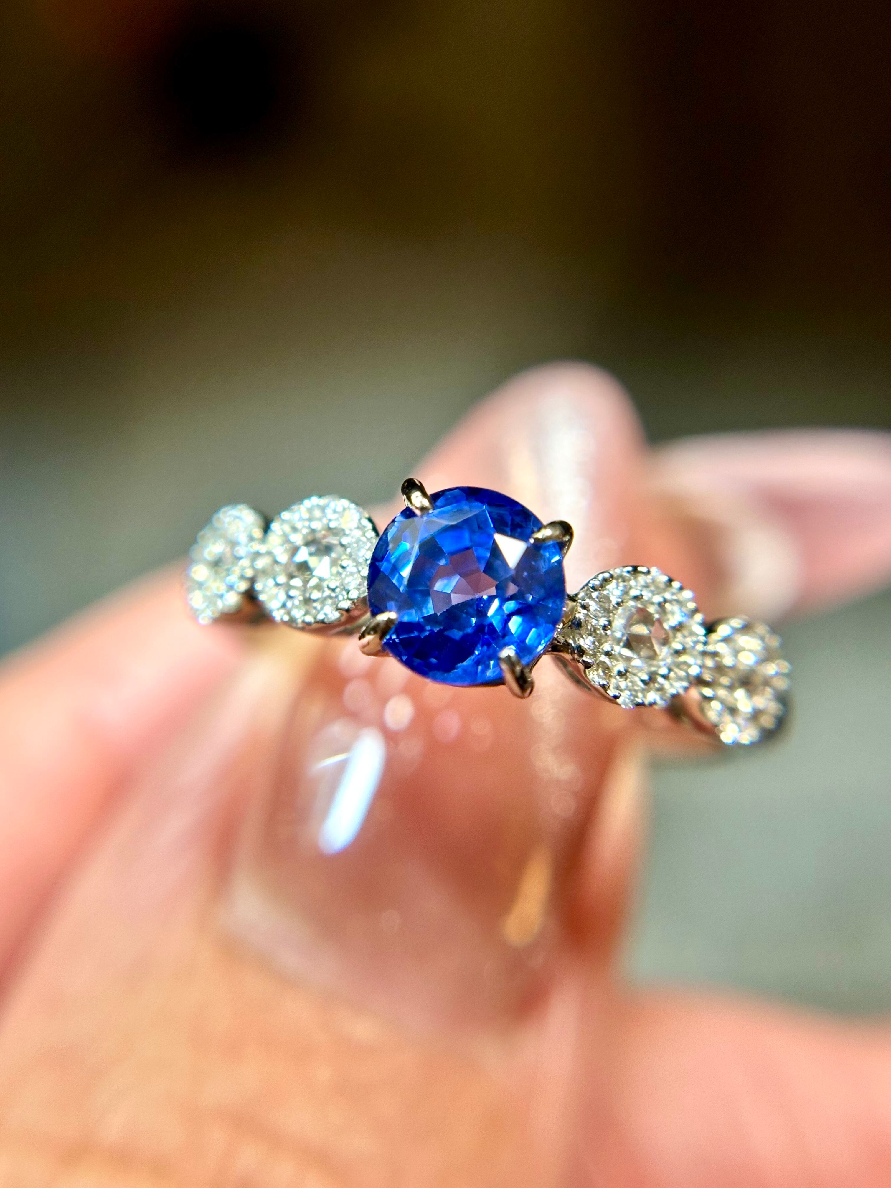 ラウンドカットから溢れてくる輝きは吸い込まれそうな青です。