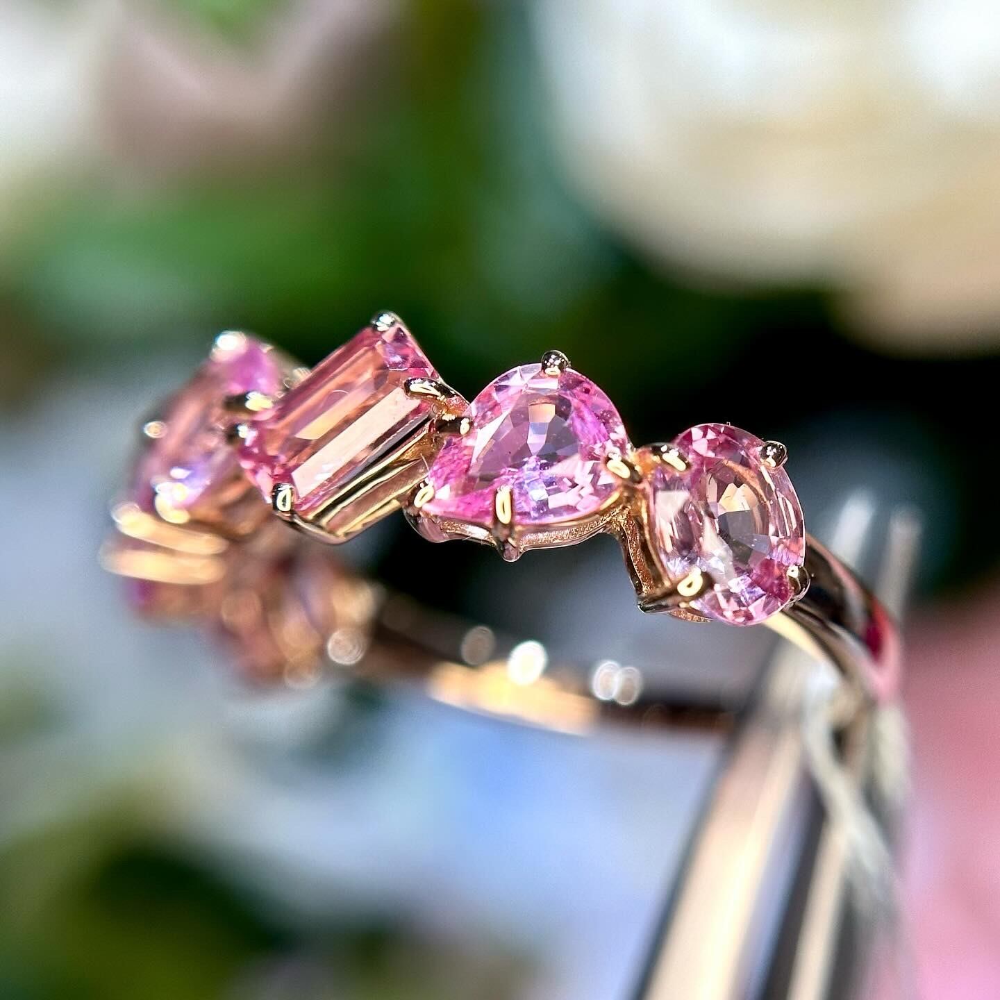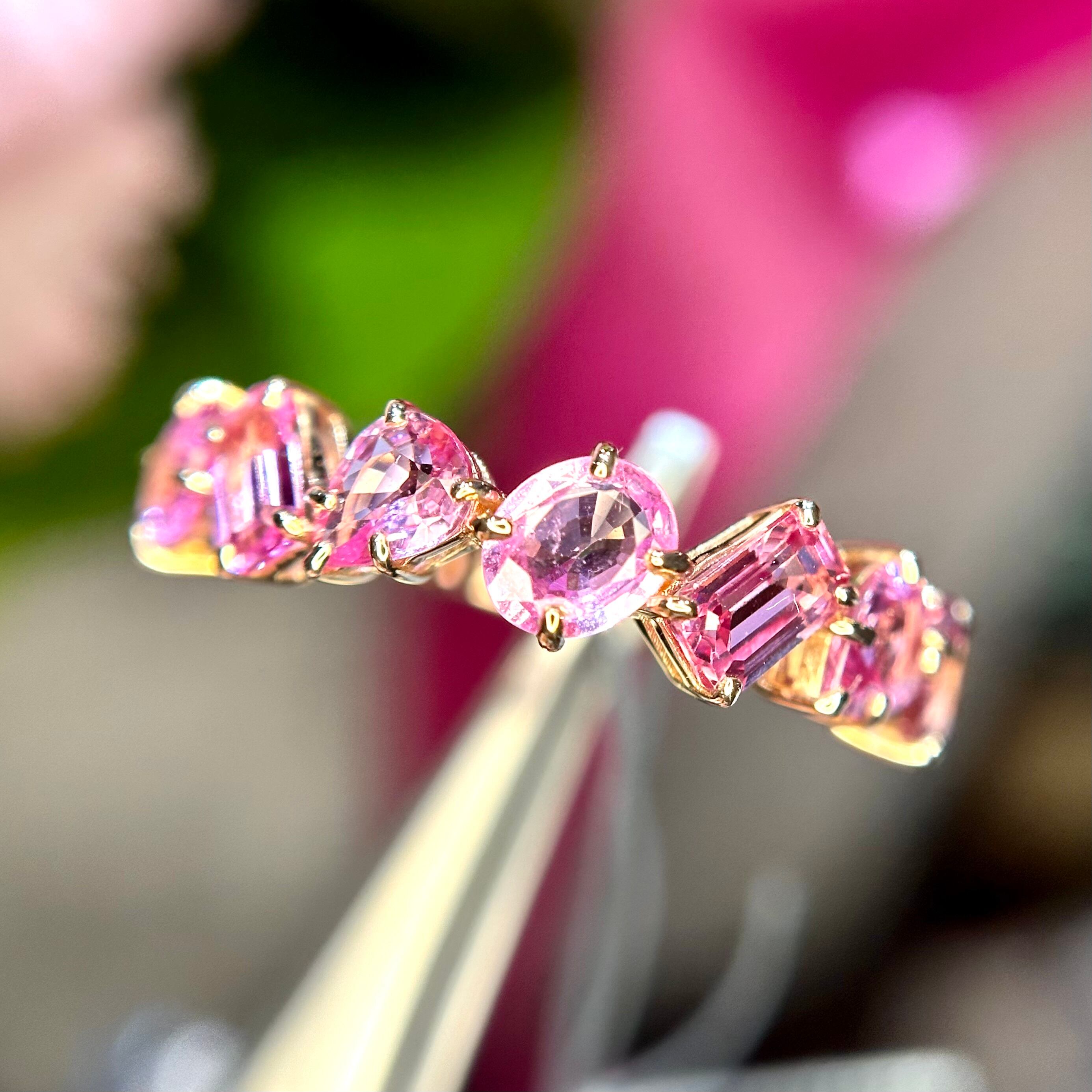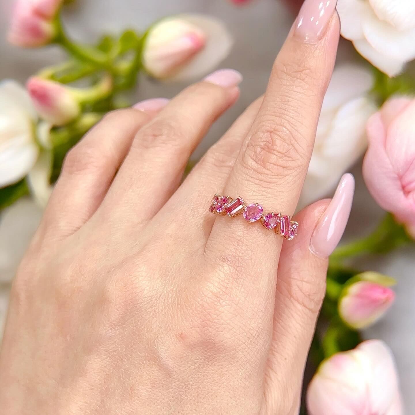 7石のパパラチアサファイアがリズミカルに並び様々な方向から光を浴びますのでお指を見る度に何度もトキメキを感じる瞬間に出会うと思います。