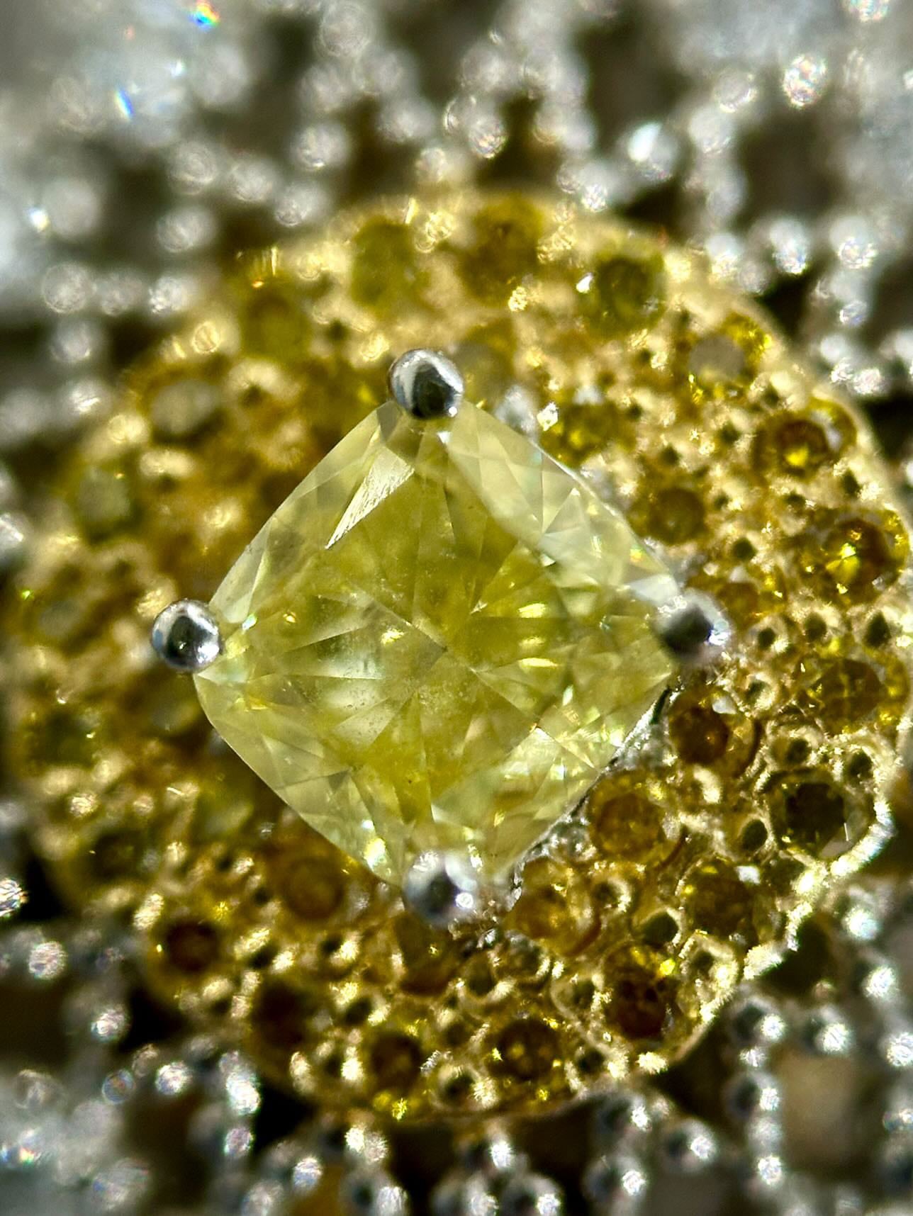 瑞々しい透明感をもつ良質なイエローダイヤモンドをセンターに周囲には更に濃いめのトリートのイエローダイヤモンド。