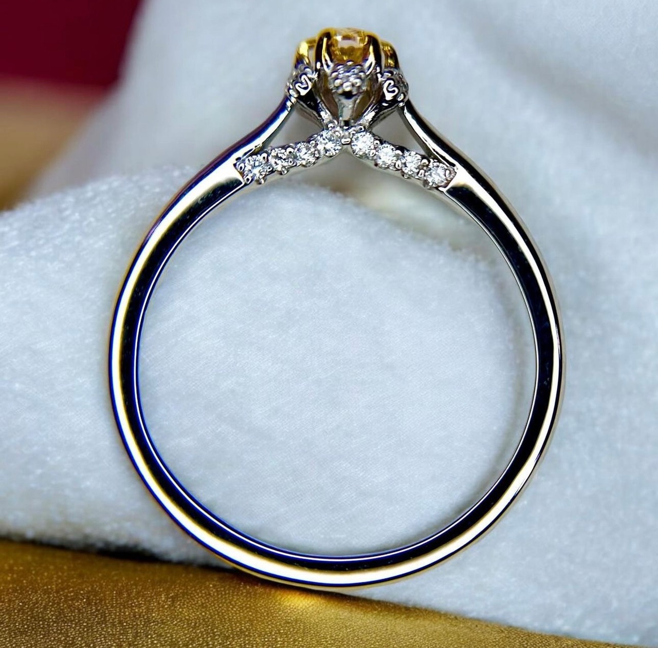 センターに美しいオレンジダイヤモンドを丁寧に持ち上げてデザインの楽しさを様々な角度からお楽しみいただけるリングです。