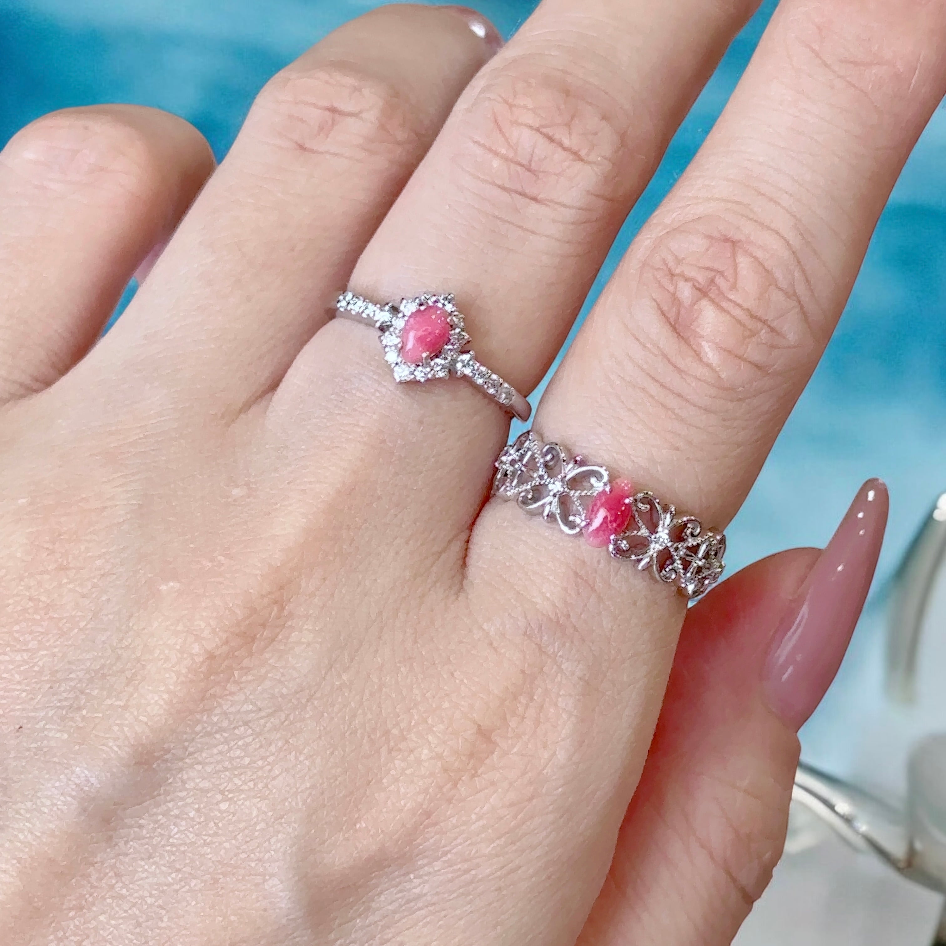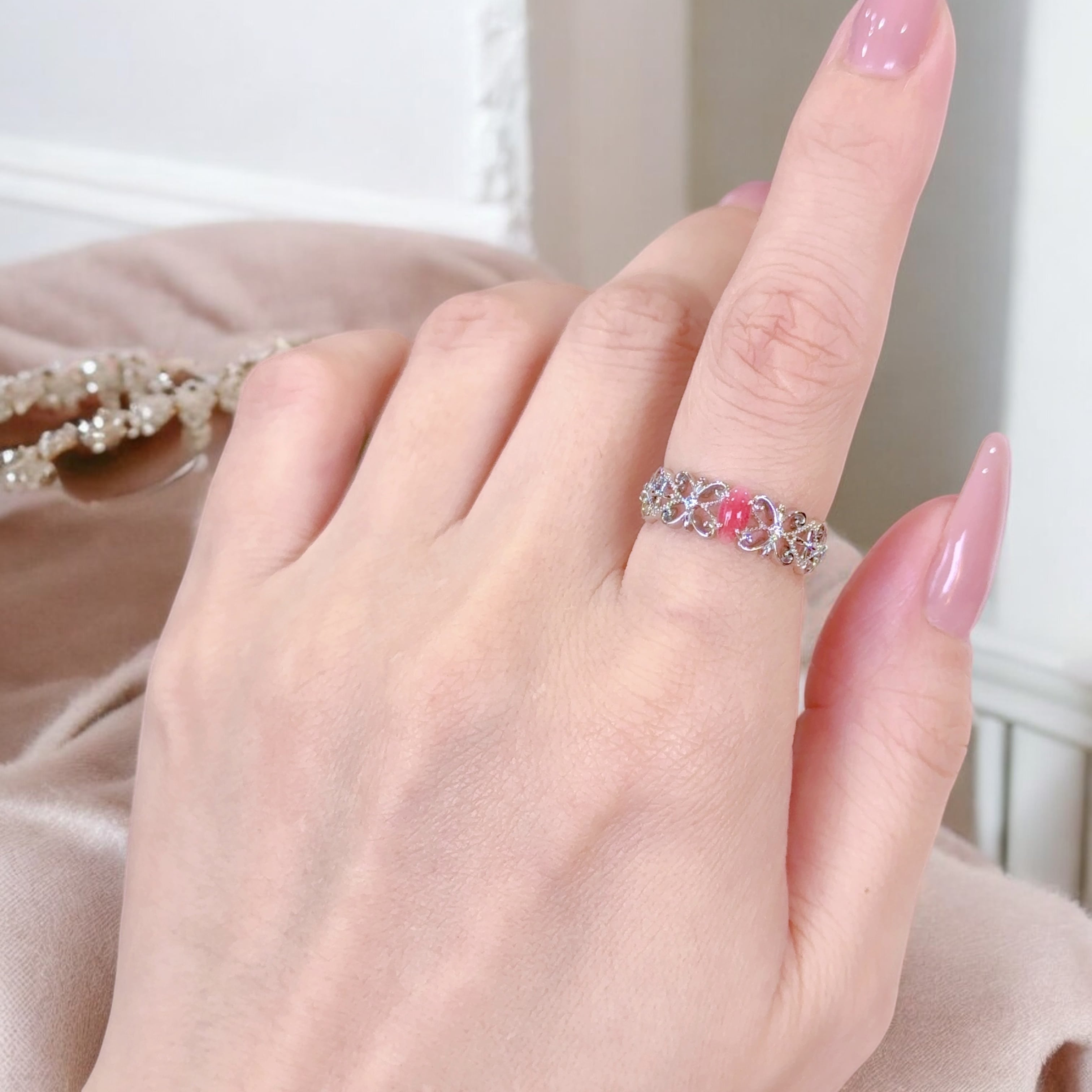 繊細に編まれたような美しいデザインがお指を纏いセンターに高揚したピンクのコンクパールが鎮座。