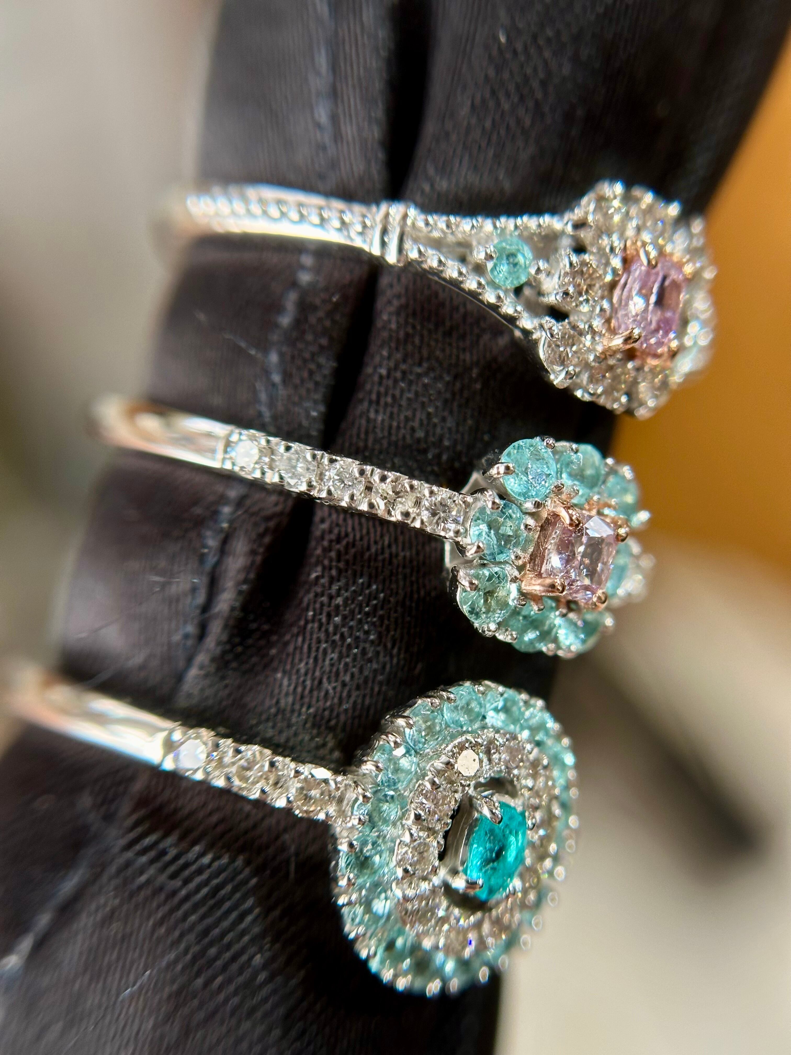 濃いセンターパライバからダイヤモンド、ダイヤモンドから明るいパライバへのコントラストも非常に美しくセンターのブラジル産パライバを出来る限り美しく見えるように工夫し作成されています。